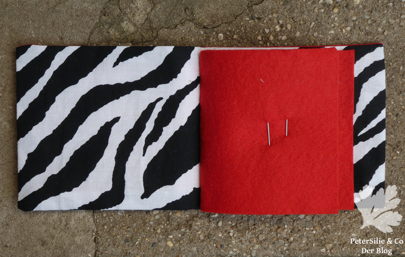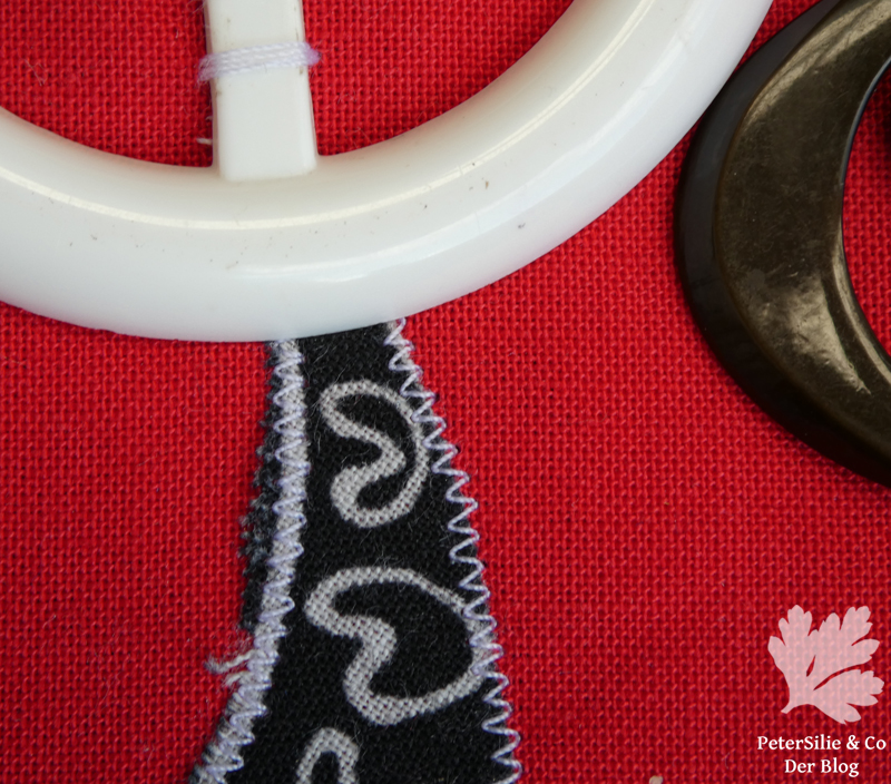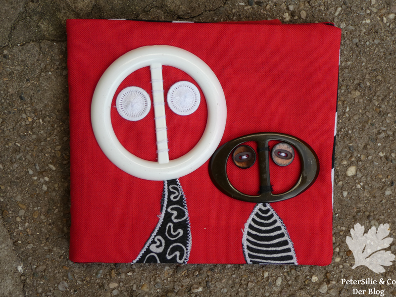Material: 2 Plastikschnallen, 4 Knöpfe, Stoffreste in rot und schwarz/weiß gemustert, Filz für den Innenteil