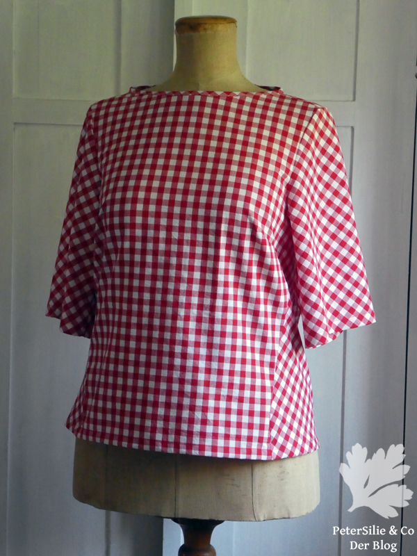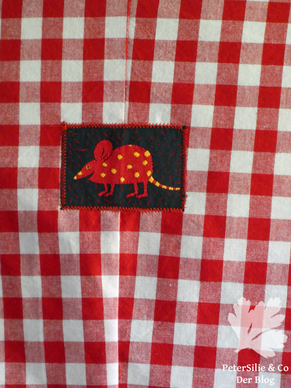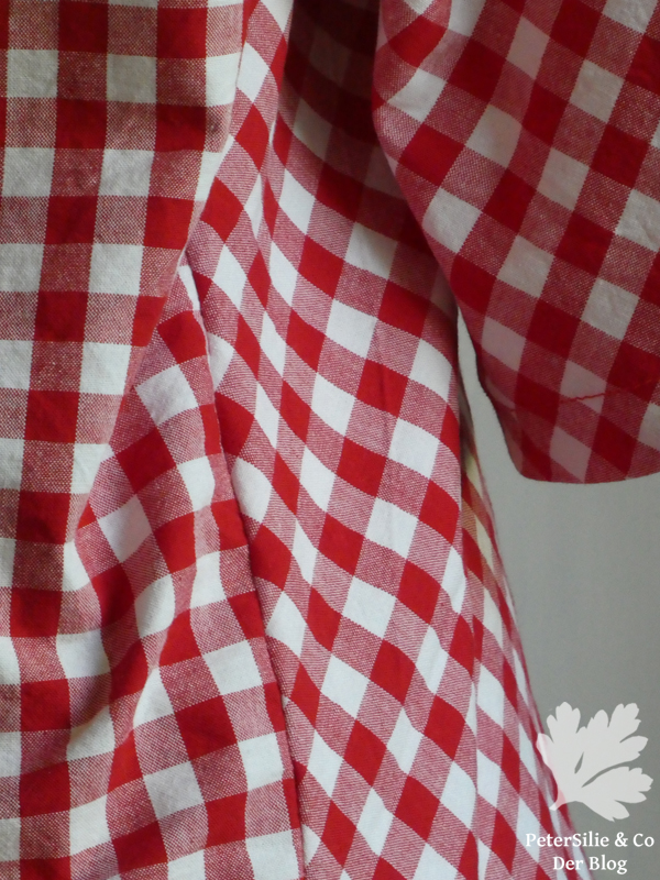 Wenn man einen Schnitt verändern möchte, sollte man natürlich erst das Original kennen. Das war dann gleich wieder ein schwerer Entschluss, nicht weil ich es nicht nähen wollte, sondern weil ich mich schon wieder nicht entscheiden konnte, wie mein Ella-Original aussehen sollte. Nachdem ich fünf Stoffkandidaten gewaschen hatte, wählte ich ein rot-weißes Bettzeugkaro, das schon lange gewaschen auf den Einsatz wartet. Es juckte mich einfach, diese von Sabine als „Oh Gott, oh Gott, Trachtenkitsch“ eingestufte Stoffart zu nähen. Ehrlich, es ist eine sehr hübsche Bluse geworden, das Tüpfelchen auf dem I ist für mich die Ratte/Maus am Rücken.(Auch wenn man das Patternmatching bei der Rückennaht besser machen könnte!)