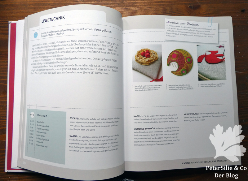 Aber zurück zu den Techniken. Auf jeweils einer Einzel- oder Doppelseite wird eine Technik vorgestellt. Dann erfahren wir einiges über mögliche Entstehungszeit und Entwicklung, Verbreitung, Anwendungen. Kurz wird dann noch die Charakteristik umrissen (bei der Schwarzstickerei zum Beispiel: geometrische Muster, ursprünglich nur Fadengebunden…) Das alles in gemütlich großer Schrift. Links unten gibt es ein graublaues Feld mit Seitenverweisen auf eingesetzte Stickstiche in alphabetischer Reihenfolge. Daneben gibt es sorgfältige Hinweise, das berühmte (wichtige) Kleingedruckte, in wesentlich kleinerer Schrift. Dadurch ist die Buchseite aber angenehm gegliedert. Wir erhalten wesentliche Informationen zum Stoff und seinen Eigenschaften (Zählbarkeit, Feinheit, die am Häufigsten eingesetzten Stoffqualitäten). Rechts ein oder mehrere Foto von Stickbeispielen, darunter wissenswertes zu Garnen, Nadeln, Zubehör und Verwendung bzw. Einsatzmöglichkeit. Bei manchen Techniken gibt es ein „kleines Notitzblatt mit Büroklammer“ rechts oben mit einer speziellen, Zusatzinformation.