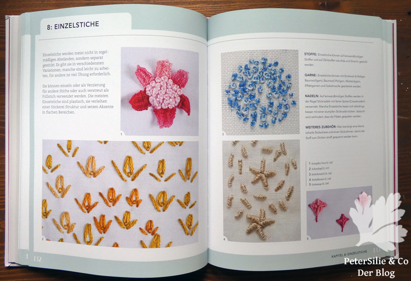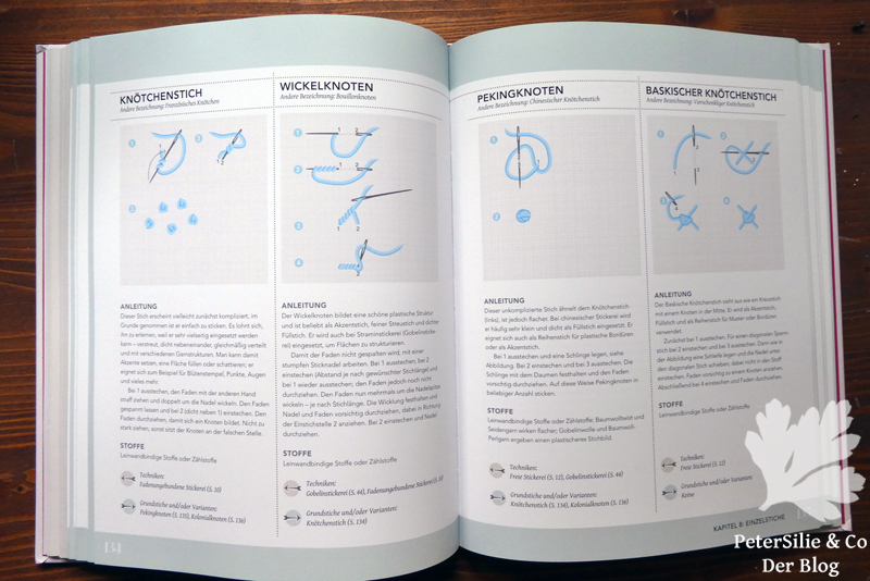 Teil zwei startet auf Seite 90 mit einem Inhaltsverzeichnis über die Stiche, gegliedert in 10 Kapitel: Zuerst die wichtigsten Grundstiche (mir gefällt der Vergleich mit den Grundfarben in der Malerei), dann folgen Reihenstiche, Kreuzstiche, Einzelstiche, Geradstiche, Schlingstiche, Kettenstiche, Durchbruchstiche, Gobelinstiche, jeweils mit vielen Varianten. Es gibt zum Beispiel 12 Kettenstichvarianten im Buch. Das letzte Kapitel umfasst Weitere Stiche (Klosterstich, Legetechnik …), also all jene, die man nicht direkt zuordnen kann. Jeder Stich wird in gezeichneten Schritt-für-Schritt-Anleitungen erklärt und im Text beschrieben, allerdings ohne Foto. Dann werden mögliche Stoffuntergründe aufgezählt, darunter verweist der Pfeil im rosa Punkt auf Techniken, bei denen der Stich eingesetzt werden kann, der Pfeil im blauen Punkt weist auf Grundstiche oder Varianten dazu, erfreulicherweise immer mit Seitenangabe. Das sollte ich einmal wirklich nützen: Ich verwende nämlich immer die gleichen Stiche, wo es so schöne Varianten gäbe!
