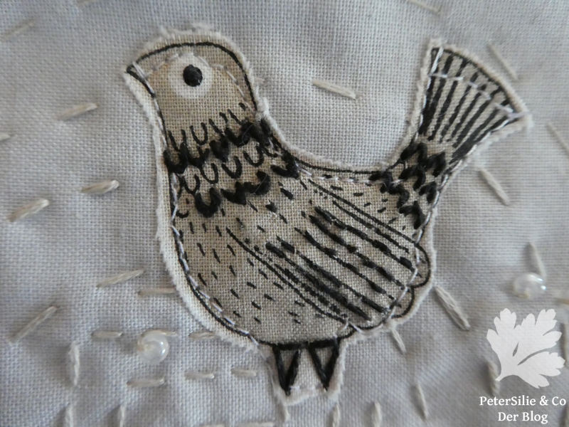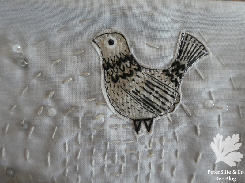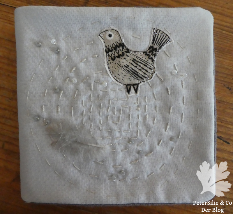 Ich gestehe, eigentlich war das ein Versuch Stille umzusetzen. Der Nadelbrief war nur mit beigen Garn bestickt und darauf drei Federn platziert. Aber mein Nadelbrief wirkte nicht still sondern unentschieden, fad und tollpatschig. Ich war gerade dabei eine Außennaht zu schließen, da sah ich ein Stückchen Stoff mit Vögeln am Arbeitstisch liegen. Die Farbe passte und es gab dem Ganzen mehr Charme und Konkretheit. Also zupfte ich zwei Federn ab und fügte statt dessen eine Taubenapplikation hinzu. Es sah zwar nicht mehr nach „Stille“ aus, aber rund und stimmig.