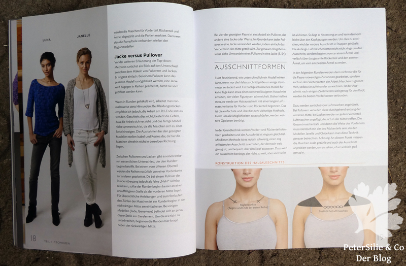 Der Untertitel des Buches lautet „14 passgenaue Pullover und Cardigans“, das sagt schon einiges aus. Es geht der Autorin tatsächlich um gute Passformen. Dora Ohrenstein erklärt deshalb sehr genau die Konstruktion der Passe (alle Modelle werden von oben gehäkelt), Passformkontrolle, Korrektur fehlerhafter Maschenanzahl und Konstruktion der Achselpartie. Ihre Pullover haben entweder Rundpassen oder sind Raglanmodelle. Wie man Auschnitte individuell verändern kann und Pullover in Jacken verwandelt beschreibt sie ebenfalls. Sie geht in ihrem Buch sehr ausführlich auf das Material, die Drehung der Wolle bzw des Garnes und die Nadelstärke ein. Weist aber auch auf die individuellen Unterschiede hin: der eine häkelt fest, der andere locker. Wie geht man damit um, wie kann man ausgleichen.