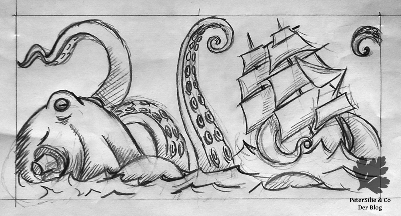 Legenden, Mythen, Seeungeheuer, Monsterkraken. Da ich den Oktopus für ein sehr faszinierendes Tier halte, wusste ich sofort, der muss beim Thema Meer auf den Nadelbrief drauf, von der Umsetzung war alles noch sehr vage, irgendwie bunt oder so. Dann machte ich lange keine Nadelbriefe und schließlich, gewissermaßen als Wiedereinstieg ins „Große Nadelbriefjahr von Frau Nahtlust„, den Nadelbrief Anatomie. Dieser Stil gefiel mir so sehr, dass ich unbedingt noch etwas in der Art sticken wollte. Ich machte mal eine kleine, grobe Skizze. Eine Krake die aus den Untiefen, wie auf den alten Landkarten, ein Schiff umschlingt und vielleicht in die Tiefe reisst. Meine Skizzen sind immer ganz klein, maximal 3 cm, ich bin einfach ein Freund der Miniatur.