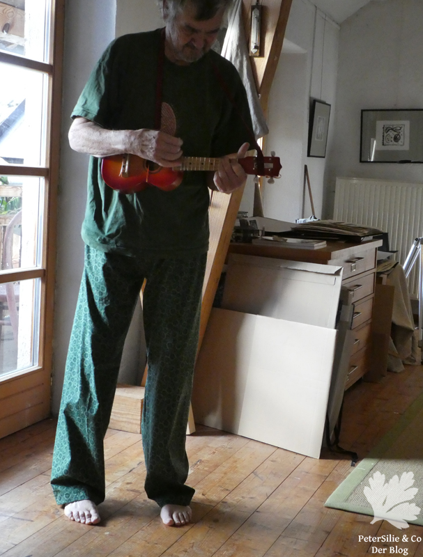 Im Gegensatz zum Katzenhemd war diesmal wirklich der Herr des Hauses Thema des Designnähens: eine Pyjamahose ohne Außennähte von SO! Pattern. Jammern, dass mein Mann nie etwas bekommt gehört zum ständigen Programm, daher hieß es nun : „Na, endlich!“