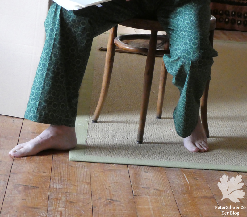 Die Sache mit der Größe fand ich nicht ganz leicht. Oh, ich merke schon, das wird jetzt heikel, also ältere Herren neigen eher zu wenig Hintern und mehr Bauch und die männliche Interpretation von Tallie ist auch etwas wechselhaft … Jedenfalls wirkt die Hose jetzt fast zu lange, vermutlich saß sie bei der Probe höher … Wie auch immer, obwohl barfuss im Winter (wegen dem Fotografieren) sogar nicht sein Ding ist, stellte er abschließend fest: „Die könnte ich gleich anlassen!“ Das ist doch schon etwas, oder?