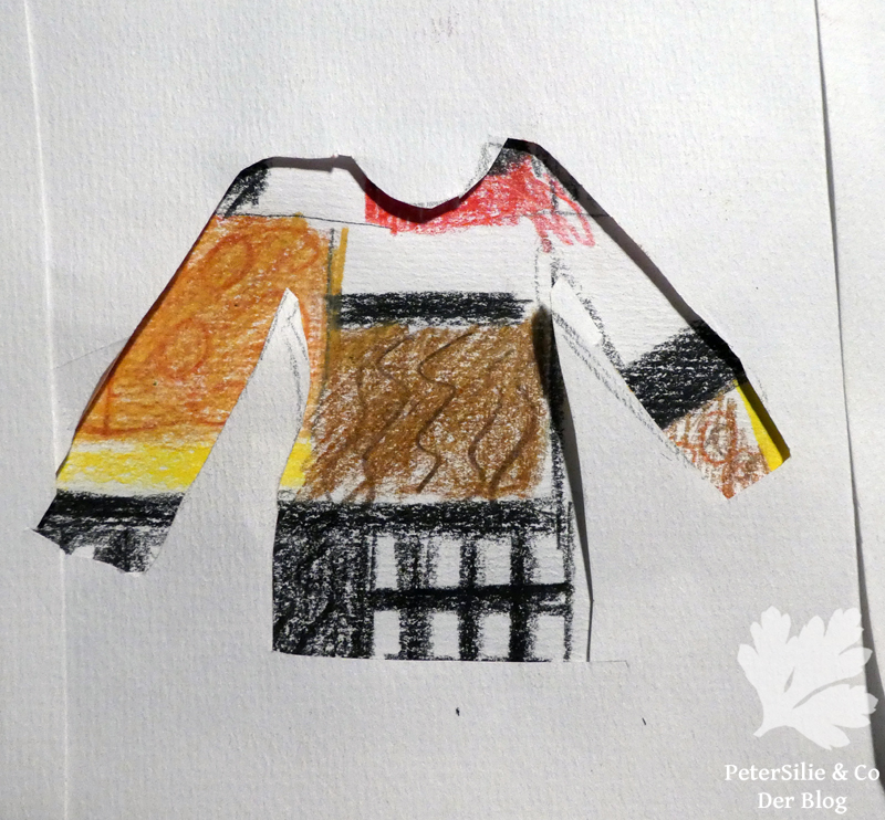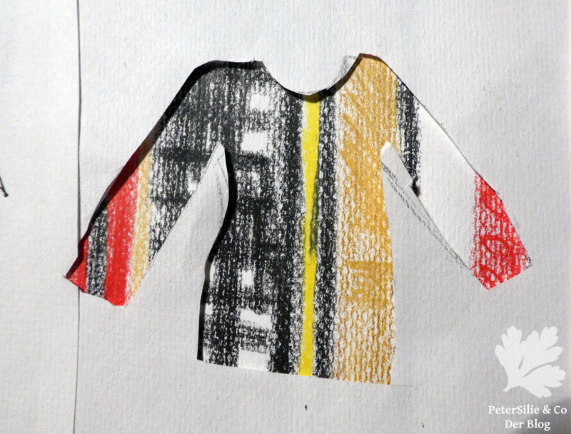 Den Stieglitz jedenfalls stelle ich mir aus kuscheliger Wolle vor. Auf den Bildern sieht man ein paar Spielereien mit einem pulloverförmigen Keksausstecher – einer Schablone, die ich auf einer vom Stieglitz/ der Kohlmeise inspirierten Fläche herumgeschoben hatte. Es war sehr spannend zu sehen wie sich der „Pullover“ veränderte. Ob das jemals mehr als eine Spielerei wird, steht noch in den Sternen …