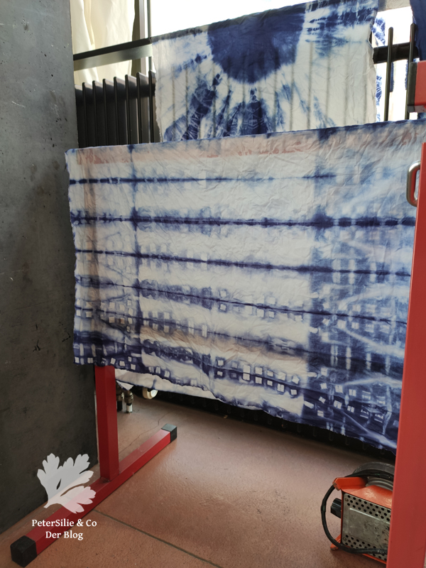 Da mir das Muster (übrigens Arashi Shibori, das bedeutet Sturm) so gut gefallen hat, habe ich es gleich ein zweites mal Stoffstück auf die Art gewickelt. Dadurch das wir eine Gruppe von acht Personen waren, haben wir uns gegenseitig inspiriert. So war ich anfänglich die einzige die sich an dem Abflussrohr/Arashi Shibori versucht hat, habe aber dann noch andere dazu inspiriert. Und auch bei den anderen Teilnehmerinnen sind die unterschiedlichsten (und großartige) Shibori entstanden.