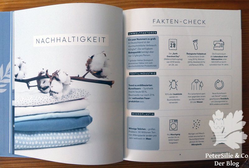 Nachhaltigkeit, ZeroWaste, Resteverwertung, Slow Fashion und Upcycling sind die großen Kapitel. Bei jedem Kapitel gibt es einen sehr anschaulich gemachten Faktencheck. Dabei erfährt man, z.B. dass Hobbynäher durchschnittlich 83 m Stoff horten oder bei einem Waschgang bis zu 3000 Teilchen Mikroplastik freigesetzt werden. Das macht gleich einmal neugierig auf mehr Wissen – das wir auch, von der Autorin gut lesbar aufbereitet, bekommen. Zum Beispiel erfahren wir über das wenig durchschaubare Thema „textile Gütesiegel“, wofür sie stehen und was sie eigentlich bedeuten. (Das Fair Trade Cotton Siegel ist ein soziales Siegel und gibt keine Auskunft über Umweltkriterien!) Genauso wird Wäschepflege und der persönlicher Kleidungsstil, samt Schrank unter die Lupe genommen. Ein umfangreiches Faserlexikon bringt uns zum Nachdenken über Stoffe und ihre Produktion.