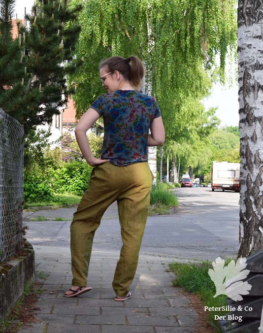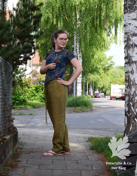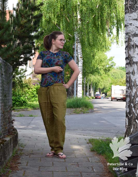 die Hose finde ich einen totalen Blickfänger, obwohl oder gerade weil sie so schlicht ist. Ich mag die Farbe auch, obwohl ich normalerweise alles, was auch nur entfernt mit Khaki verwandt ist, verächtlich wegwedele. Dieses Grün hat aber was von Seeufer, schwedischen Wäldern und Natur.