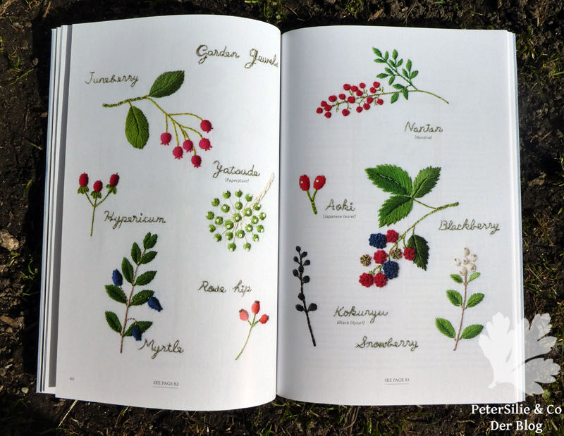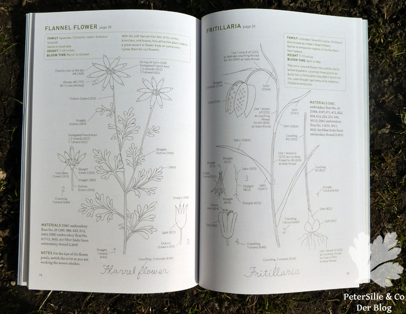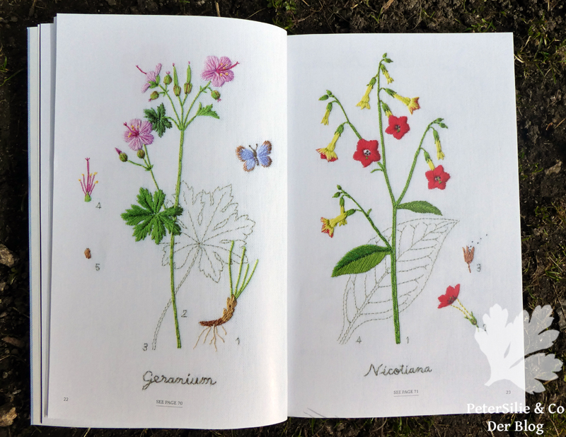 Aber zurück zu dem Buch und den Motiven. Das Buch bietet auf 96 Seiten eine wunderbare Auswahl an Pflanzen bzw. Blumen und Blüten. Es gibt größere Einzelmotive und Zusammenstellungen kleinerer Motive. Einige Blumen im Buch sind wie in den alten gezeichneten Naturbüchern gestickt: Mit lateinischer Beschriftung und teilweise noch extra Detailstudien von Blättern oder Blütenständen.
