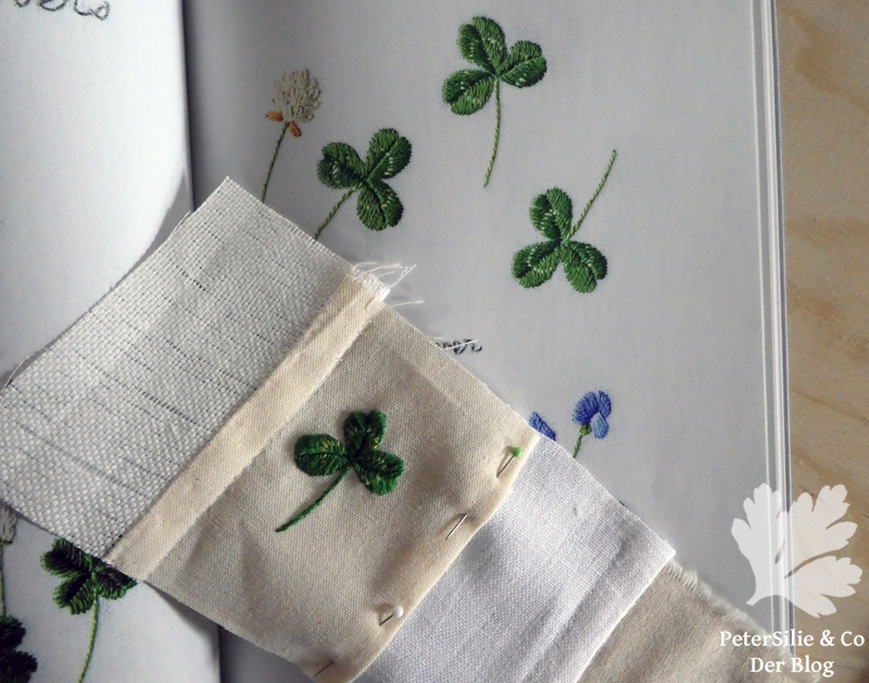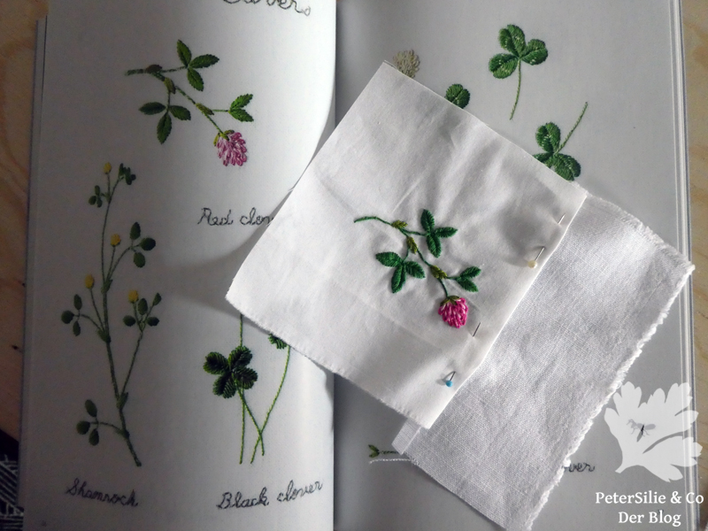 Nach dem ersten Versuch mit der Biene wagte ich mich an den Klee als Einzelblatt und einmal mit Kleeblüte – meine zugegebenerweise einzige Blume in der ganzen Sammlung an Stickereien nach dem Buch.