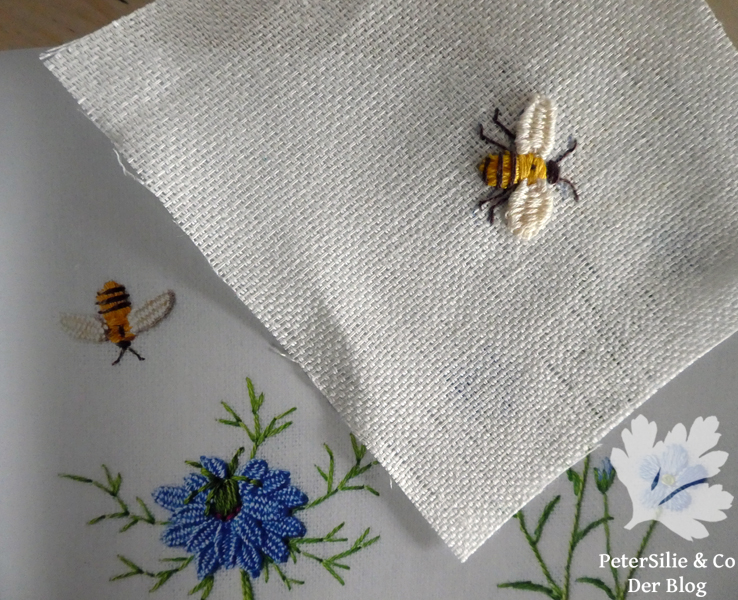 Das Buch ist voller wunderbarer Studien und eine Liebeserklärung an die Natur, einfach schön und genau mein Geschmack. Wenn ich mich richtig erinnere, war mein erstes Motiv aus dem Buch die Biene. Diese habe ich einfach wild drauf losgestickt und erst etwas später, nachdem die Biene fertig war und anders als im Buch aussah, kam mir die Idee doch vielleicht mal einen Blick auf die Anleitung bzw. Hintergrundinformationen zu werfen.