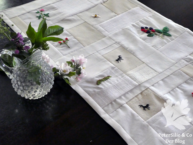 Ich hatte die Stickerein auf vielen kleinen Stoffstückchen gestickt, ohne konkreten Plan, was damit später zu tun wäre. Diese Aufgabe habe ich sozusagen ausgelagert. Kurz gesagt, ich habe die gesammelten Stickerein an meine Mama weitergegeben, damit sie etwas damit macht.