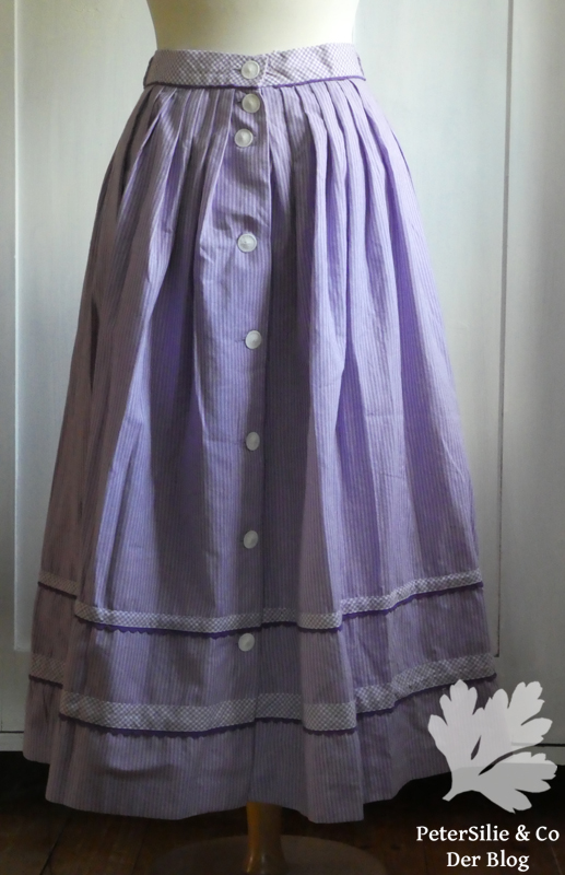 Mein fliederfarbenes Kinderkleidchen habe ich aus einem fehlerhafte Second Hand Damentrachtenrock von coBRANDa geschneidert – das Projekt sowie das des ersten Ergebnisses haben wir bereits vorgestellt. Die Farbe ist für (traditionelle) Trachten bzw. Dirndlmode eher unüblich, mit einem Wort viel zu dekadent. Lichtes Lila verbindet man (abgesehen von Schokolade) eher mit Rokokofräulein und nicht mit Bauernmädels. Aber, wie so oft, schreiten Modeschöpfer fröhlich über alle Grenzen und es gibt Dirndl und Trachtiges in allen Farben, und – es sieht auch (mit der richtigen Trägerin) chic aus. Der Rock ist aus guter Baumwollqualität, mit einer Knopfleiste vorne, zwei Zierbändern und Futter. Die Farbe wirkt aber so luftig, leicht und fröhlich, dass ich sie einfach ideal für ein Kinderkleidchen fand.