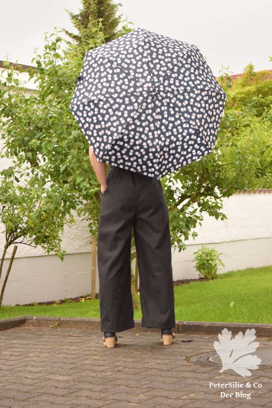 Mit meinem Po würde ich in mind. eine Größe größer fallen, das hab ich ignoriert und bin mit dieser Entscheidung sehr gut gefahren. Auch die Fertigmaße haben mich in dieser Frage unterstützt – eine sehr angenehme Vorabinformation, wenn man bei der Grösse unsicher ist. Ich habe ein schwarzen Leinen von Rijs Textiles genommen – ich würde ihn als mittelsteif beschreiben. Der Stoff bzw. dessen aktueller Stand ist das einzige Manko: Das Leinen ist noch etwas steif, so dass man die Falten am Po ein bisschen arangieren muss, damit hier nicht steife Ecken eine Unform erzeugen. Und meine 10 Zentimeter Verlängerung am Hosenbein waren zu wenig. Ich habe hier eine Saumblende eingenäht (mit 7mm NZ), um einigermaßen auf Knöchellang zu kommen, bei einer Körpergröße von 166!