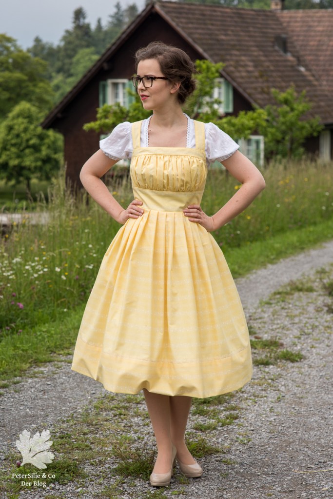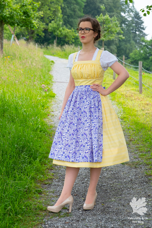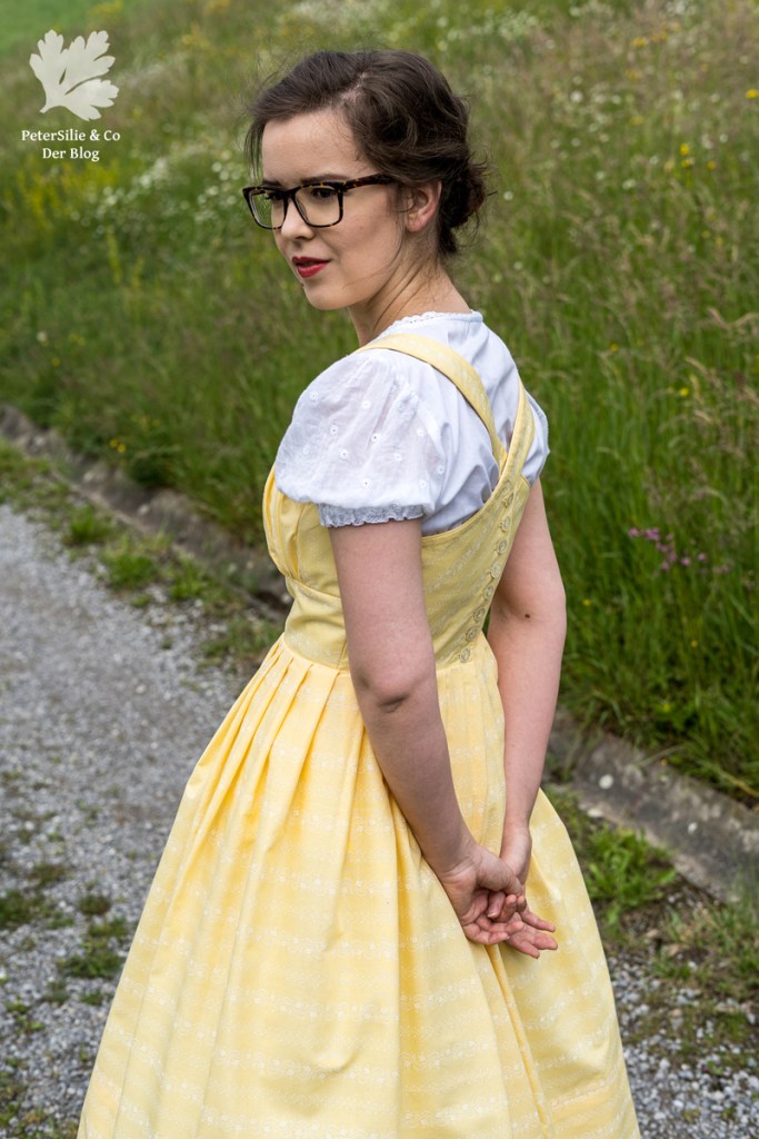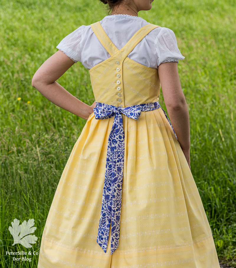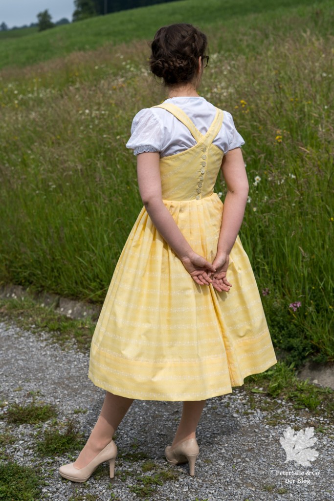 Ich habe mich von all den Modellen mit gezogenem Brustfleck für das Wienerwald Waschdirndl entschieden. Ursprünglich besteht es aus einem rot karierten Leib, einem blauen Rock und einer hellblauen Schürze.  Nicht so meine Faben, aber das habe ich ja geändert, indem ich mich für einen vanillegelben Stoff mit weissen Print entschied. Das Spezielle an diesem Waschdirndl ist, dass es hinten geknöpft wird. Zugegeben das macht das Anziehen etwas sportlicher mit dem Verrenken, aber es ist machbar. Dazu kommen sich kreuzende Träger und vorne eben der gezogene Brustfleck. Was auch noch typisch für das Waschdirndl ist, es sind üblicherweise luftige Sommerdirndl, die oft ohne Bluse getragen werden und auch ohne Schürze.