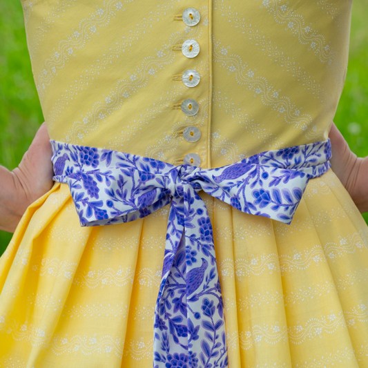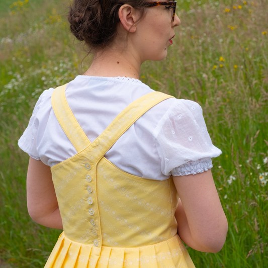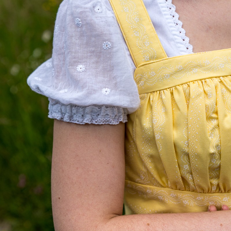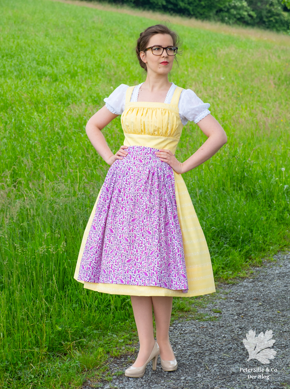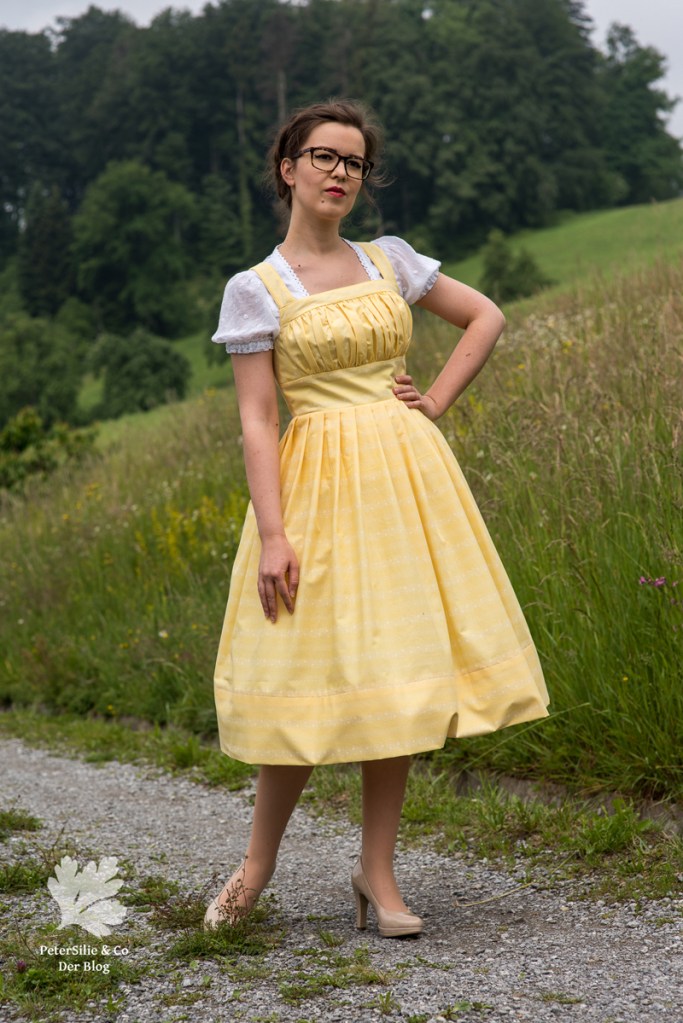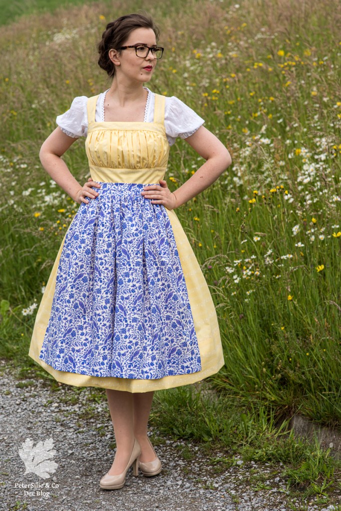 Ich habe mich von all den Modellen mit gezogenem Brustfleck für das Wienerwald Waschdirndl entschieden. Ursprünglich besteht es aus einem rot karierten Leib, einem blauen Rock und einer hellblauen Schürze.  Nicht so meine Faben, aber das habe ich ja geändert, indem ich mich für einen vanillegelben Stoff mit weissen Print entschied. Das Spezielle an diesem Waschdirndl ist, dass es hinten geknöpft wird. Zugegeben das macht das Anziehen etwas sportlicher mit dem Verrenken, aber es ist machbar. Dazu kommen sich kreuzende Träger und vorne eben der gezogene Brustfleck. Was auch noch typisch für das Waschdirndl ist, es sind üblicherweise luftige Sommerdirndl, die oft ohne Bluse getragen werden und auch ohne Schürze.