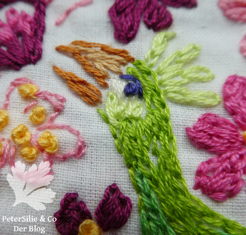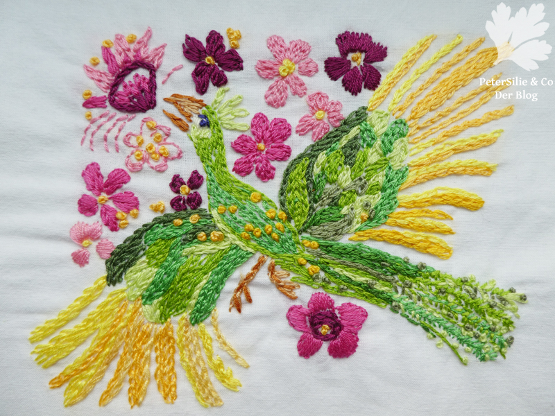Der Vogel, als Vermittler zwischen Erde und Himmel, gilt auch als Symbol für Hoffnung und Zuversicht. Sein Flug weckt Assoziationen zu Freiheit, Unabhängigkeit, zu freien Gedanken und Ideen… So beginnt die Einladung zum Friedenssticken. Die Idee dahinter: ein friedliches Beisammensein und Sticken. Eigentlich wollte ich schon längst über das Friedenssticken berichten, aber irgendwie ging alles ein wenig durcheinander die letzten Monate. Trotzdem möchte ich euch heute meinen gelbgrünen Friedensvogel vorstellen. Er ist sehr stark farblich inspiriert von meinen Wellensittichen, die man jetzt nicht unbedingt als typische Friedensvögel bezeichnen würde. Aber sie tollen so fröhlich und vergnügt kopfüber, kopfunter in ihrer zimmergroßen Voliere herum, dass allein, wenn ich ihnen zuschaue, meine Stimmung steigt.