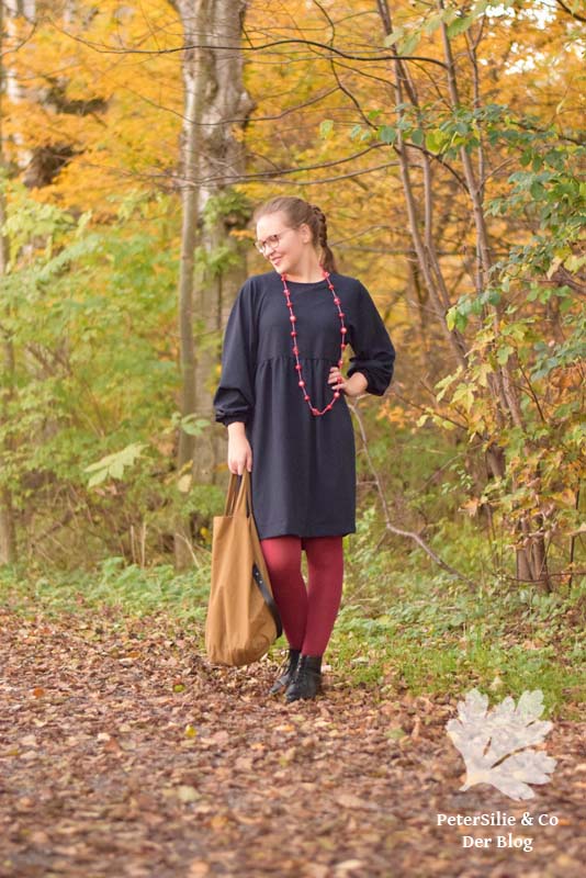 Das Originalkleid ist in Midi- oder Knielänge, mit 3/4-Ärmeln und einem Schlitz hinten um das Reinschlüpfen zu erleichtern. Für mich war das Kleid ganz klar als Herbst-/Winterkleid geplant – alleine der Stoff und die Farbe machen dies eindeutig. Daher habe ich die Ärmel um 20 cm verlängert. Durch den Gummi hat man – wie auf den Fotos zu sehen, die Gelegenheit diese auch wieder hochzuschieben.