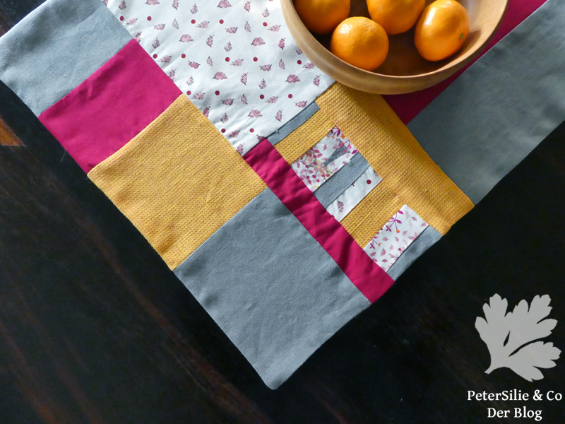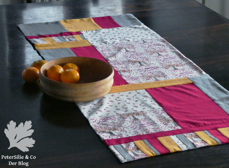 Entstanden ist ein sehr aparter Tischläufer in starken Herbstfarben: Grau, Himbeerrot (ein Rest von Sabines Münchener Dirndlschürze), Goldgelb (ein Rest von Sabines gelber Handloombluse). Große Mondrianartige Farbblocks und einige kleingliedrige Elemente sorgen für Abwechslung ohne allzu unruhig zu wirken. Für ein Kissen blieb auch noch Stoff -ich bin immer wieder erstaunt wieviel man mit kleinen Stoffstücken machen kann. Etwas Material ist noch vorhanden , damit möchte ich eine andere Farbkombination versuchen…
