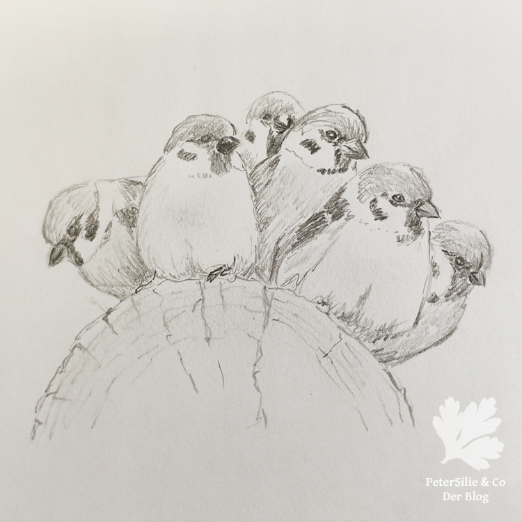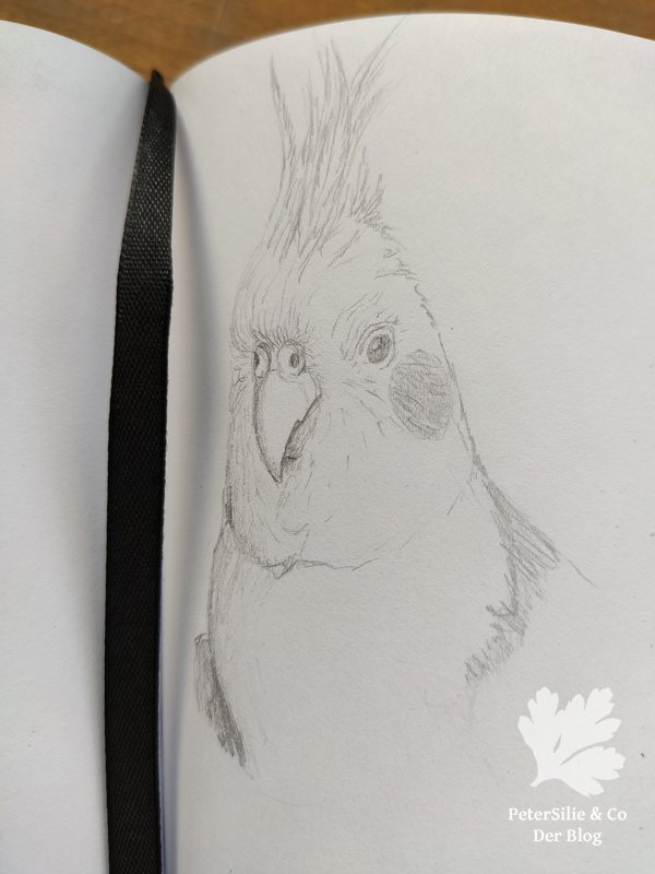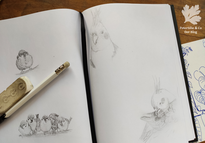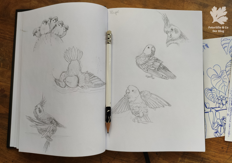 Das begeisterte mich jetzt auch nicht so, also schwenkte ich auf kleine Bleistiftskizzen von Vögeln um. Der Flügel ist ja schliesslich essentiell für den Vogel, also keine Verfehlung des Themas. Als Basis meiner Zeichnung dienten mir die Spatzenbilder von onakan_s, die Nymphensittiche sind nach ryoichisakai und der Agapornis (Unzertrennliche, der Vogel ohne dem dekorativen Kopfschmuck) ist nach tokyoshiori