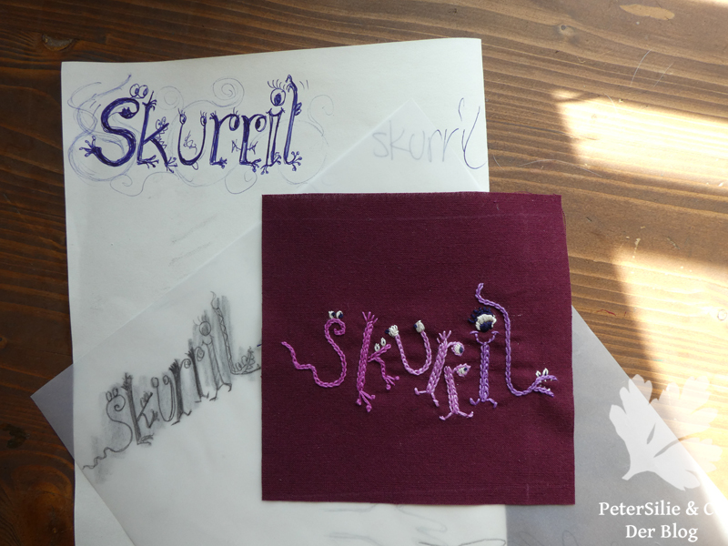 Totenköpfe, Innereien aus denen Blumen wachsen und dergleichen morbide Dinge sind nicht unbedingt meine Sache- zumindest hatte ich keinerlei Lust so etwas zu sticken. Daher suchte ich ziemlich lange nach anderen Skurrilitäten. Nachdem ich aber in letzter Zeit ziemlich viel über Schrift, Kalligraphie und Lettering gelesen und etliche Bücher, alte und neue, durchgesehen hatte, dachte ich mir: Dann versuche ich es eben mit dem Wort skurril. Ich hatte gerade jede Menge vollkommen verrückte Schriften und Alphabetschöpfungen gesehen, vieles ansprechend und inspirierend, manches nur noch seltsam. Wie auch immer, ich habe herumgekritzelt und versucht mein „skurril“ zu finden…Herausgekommen sind Augentierchenbuchstaben mit Füßchen. Die Farben ergaben sich durch den, von mir gewählten, weinroten Grundstoff. Bei diesem Stickgrund bereitet es mir große Schwierigkeiten passende Garnfarben bzw. Kombinationen zu finden. Daher blieb ich bei Rosatönen. Das wirkt im Zusammenhang mit dem Begriff skurril ja tatsächlich recht seltsam.