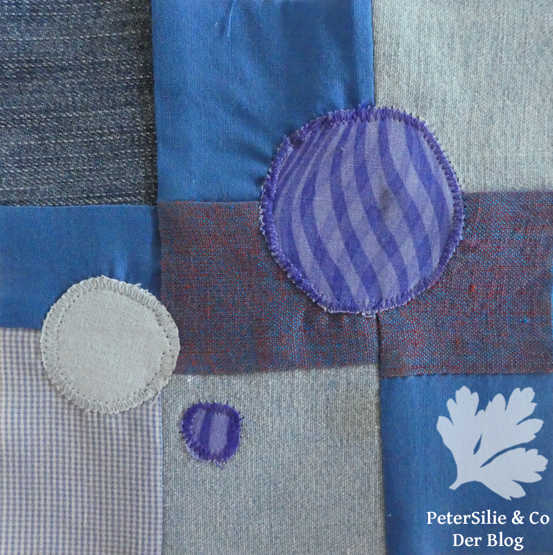 Nun, so leicht wollte ich es mir doch nicht machen. Also entschied ich noch einen Kreis darauf zu applizieren. Der eine Kreis wirkte jedoch nicht recht überzeugend. Eher so: Wieso ist da ein Kreis drauf? Die Lösung hieß: mehrere Kreise, leider ist der kleine Dunkelblaue etwas deformiert. Außerdem sind Flecken drauf vom Bügeleisen.