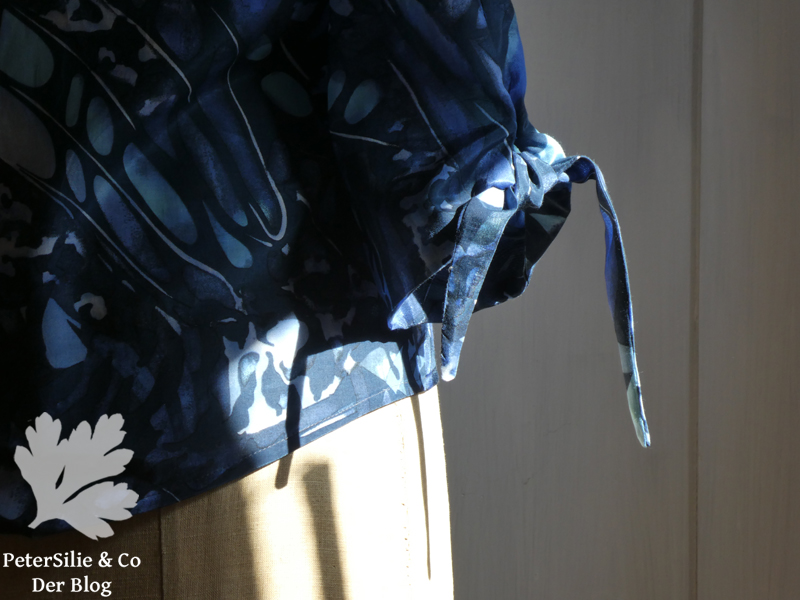 Ich war schon länger auf der Suche nach einem Blusenschnitt, der möglichst praktisch und bewegungsfreundlich ist, idealerweise auch wintertauglich (Langarm und hochgeschlossen) und doch chic ist. Zuerst habe ich einmal ein Modell aus dem Rest von Sabines pinken Mary Quant-Kleid genäht. Diese Bluse erhielt kurze Ärmel- aus Stoffmangel. Zugegeben, die Bluse ist nicht sehr schön genäht, genauer gesagt: die Ärmel sind sehr unregelmäßig gezogen (Das ist sogar meinem Mann aufgefallen! Zudem sind die Abstände der Knopflöcher zu groß.) Aber es zeigte sich: Die Passform ist großartig, leicht taillliert, gerade oder geschwungen am Saum. Das war es, was ich wissen wollte. Ich war ein wenig am Jammern, wegen der Knopflöcher. Eine etwas tailliertere Bluse gibt es allerdings nicht ohne – es sei denn, man nimmt eine mit Reissverschluss. Dabei ist eine Knopflochleiste ein sehr schönes gestalterisches Element, streckt optisch und gibt Platz für schmückende Knöpfe. (Ich liebe Knöpfe, nähe aber ungern Knopflöcher, das ist ein unlösbares Dilemma) Mittlerweile habe ich verschiedene Ärmel und Kragenvarianten genäht, allesamt tragbar, natürlich selten perfekt. Eine reizende Version in Blautönen möchte ich heute näher vorstellen: sie hat Dreiviertelärmel und einen großen runden Ausschnitt. Ein besonders wirkungsvolles Detail ist der Ärmelabschluß mit den angeschnittenen Bändern zum Knüpfen. Außerdem hat sie sehr elegante Knöpfe erhalten.