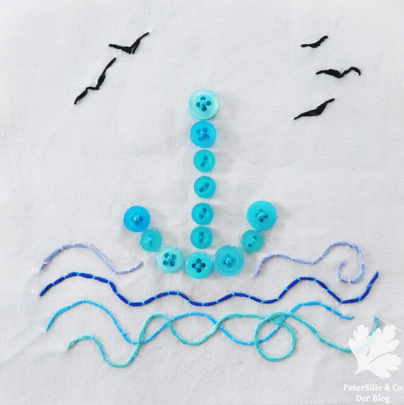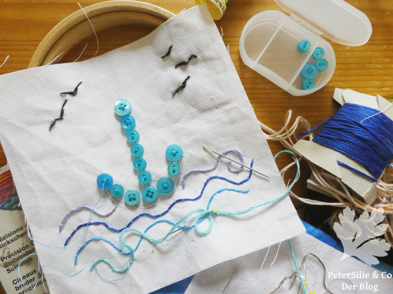 Zum Thema Anker gibt es ein Foto in meinem allerersten Notitzbuch. Es ist ein aus Knöpfen genähter Anker auf einer sommerlich wirkenden Strohtasche, einer Strand- oder Badetasche vermutlich. Das ist so eine Idee, die ich immer schon einmal gerne aufgreifen wollte. Das einzige was ich nicht bedachte war der Größenunterschied. Es ist relativ leicht einen schönen Anker aus Knöpfen für eine große Tasche zu gestalten, bei meinem doch wesentlich kleineren Format von 14 cm x14 cm war es dann doch schwieriger. Deshalb erhielt er auch ein wenig „Drumherum“, mein Anker. Aus den schönen Blautönen der Vorlage wurde Türkis, da ich davon eine Menge kleiner Knöpfe fand.