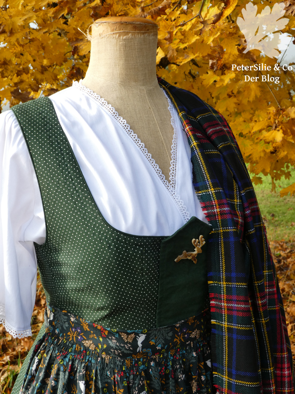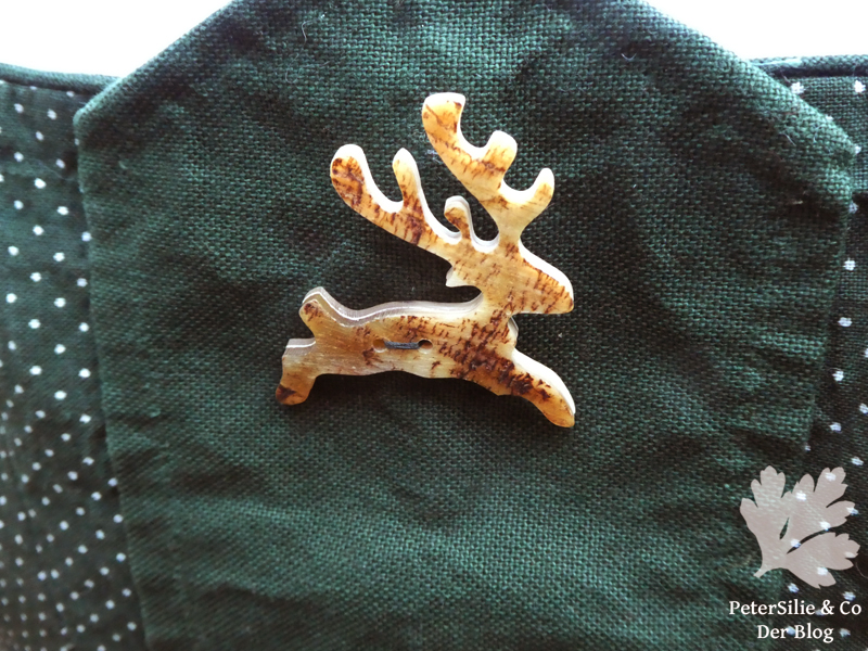 Da ich natürlich irgendein Dekor auf dem Dirndleib haben wollte, habe ich ein wenig herumprobiert, Kettchen, Knöpfe, eine Stickerei? Dann fiel mir dieses aus Horn geschnittene Hirschlein ein, das ich am letzten Webermarkt in Haslach erstanden hatte, und das gefiel mir sofort.
