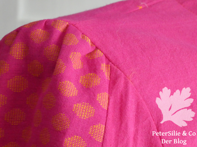 Für diesen pinkfarbenen, handgewobenen Jaquard von Karlotta Pink habe ich nach einem „Rettungsmodell “ gesucht. Eigentlich wollte ich eine Schemaschnittbluse (beschrieben in Himmel, Flieder, Ozean) daraus machen. Aber ich habe zu schmal zugeschnitten, keine Ahnung warum, ist einfach so. Dabei sollte ich das können. Ich hatte damals zwei farblich perfekt abgestimmte, aus derselben Kollektion stammende Stoffstücke gekauft. Auch im ursprüngliche Modell wollte ich sie miteinander kombinieren. Jedenfalls musste ich aus den beiden Mustern und bereits zerschnittenen Stoffen irgendeine Form Patchwork finden, um wieder genug Stoffbreite zu gewinnen. Das ist immer wieder spannend, weil ich nie so ganz genau weiß, was herauskommt, aber das Ergenis ist entzückend.