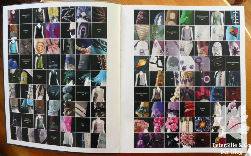 Ich wollte unbedingt solch aufregende Volants an den Ärmeln einer Bluse versuchen. Warum? Weil ich so etwas in einem wunderbaren Buch gesehen habe: Creating Couture Embellishment von Ellen W. Miller erschienen bei Laurence King Publishing. Ellen W. Miller unterrichtete an der Boston School of Fashion, und zwar Couture Details, Konstruktion und Schnittentwicklung. Sie arbeitete auch als Kostümdesignerin für Theater in den USA und Europa. Schon bei dem Fotomosaik-Inhaltsverzeichnis kommt man ins Schwärmen.