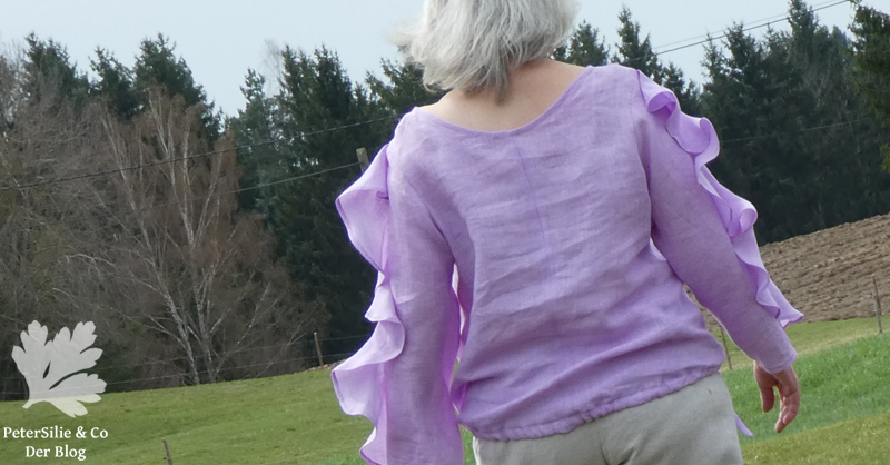 Zu meiner Bluse: Ich habe aus den knapp ellbogenlangen Ärmel lange Ärmel gemacht, und den Ärmel eher schmäler werden lassen. Der Ärmel wird am Schulterpunkt längs durchgeschnitten, dann den, aus einem Kreis geschnittenen, gleichmäßigen, bereits gesäumten Volant dazwischennähen.