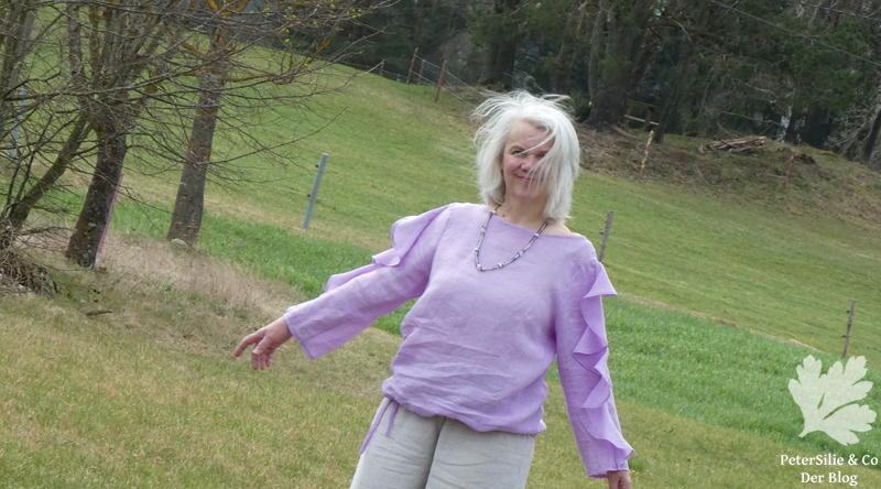 An einem schmaleren Ärmel hätten die Volants vielleicht noch besser gewirkt, da hätte ich einen anderen Schnitt wählen müssen. Das feine Leinen hat genug Stand und bringt den Schwung gut zur Geltung. Ich war sehr lange unschlüssig wie ich den Saum gestalten sollte, letztlich entschied ich mich für einen Gummizug mit vorgetäuschten, angenähten Bändern. Der Halsausschnitt ist ebenfalls etwas vergrößert. Man sie es auf den Fotos: frisch gebügelt sieht die Bluse fantastisch aus, aber einmal bücken um die Schuhe anzuziehen war schon zuviel. Leinen, reines Leinen knittert extrem. Dafür entschädigt es mit Stang, guter Verarbeitbarkeit und Glanz.
