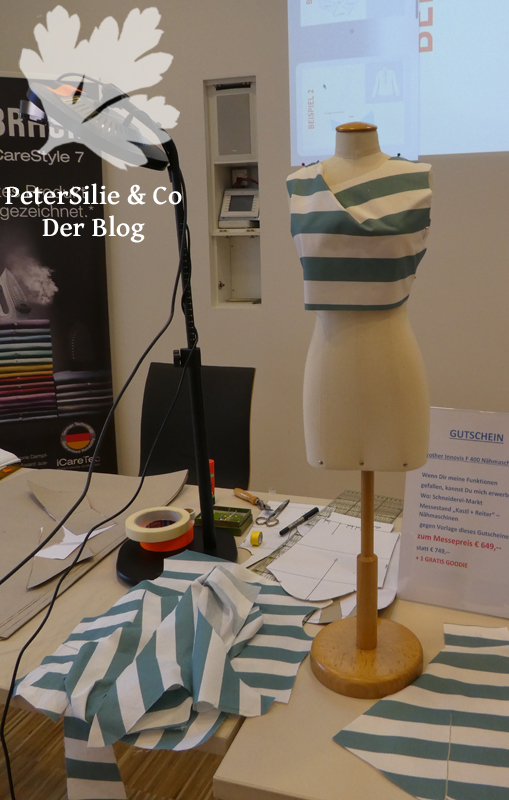 Ich selber habe Coole Twists bei Blusen von (no, na) Stefanie Kroth angehört und gesehen. Ganz einfach deshalb weil sie ihr Buch „Der perfekte Blusenschnitt„, erschienen im Stiebner Verlag vorstellte, ich dieses Buch besitze und über den immerhin schon genähten Grundschnitt nicht hinausgekommen bin. Tatsächlich habe ich eine Menge gelernt. Es war eine nette Atmosphäre, Zwischenfragen jederzeit möglich. Es hilft doch sehr, wenn man den Prozess der Veränderung mitverfolgen kann und jemand Wesentliches dazu erklärt und man das Modell noch untersuchen darf, um den Herstellungsvorgang zu verstehen. Danach hatten Stefanie und ich noch ein kleines, aber sehr unterhaltsames Gespräch. Ich fotografierte ihre „halbe Größe“- Modellpuppe, und sie schwärmte gleich: das ist eine Stockmannpuppe und wochenlang hat sie den Karton aufgehoben mit dem Aufdruck Stockmann, nur um sich daran zu erfreuen… Immerhin arbeitet die Pariser Haute Couture mit diesen Puppen… Außerdem erzählte sie von ihrer Begeisterung fertig genähte Modelle zu analysieren, wie ist das konstruiert, genäht, gebaut… Da verschwinde sie schon mal in der Anprobe eines Modegeschäfts, um den Dingen aus beruflichem Interesse auf den Grund zu gehen, bis jemand fragt: „Brauchen Sie Hilfe?“. Das Buch „Der perfekte Blusenschnitt“ habe ich übrigens am nächsten Tag gleich nochmal intensiv durchgesehen. Das eine oder andere -das bis jetzt unklar war-stellte sich nun anders dar.