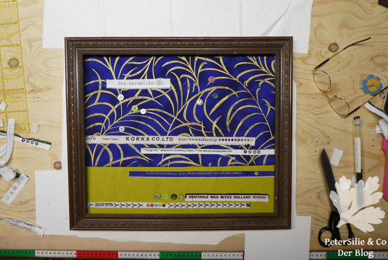 Zweiter Schritt: Die große Frage: Was mache ich mit den abgeschnittenen Webkanten? Etwas völlig unnützes, einfach einmal nichts zweckmäßiges. Ich spazierte auf unseren Dachboden und hielt nach einem alten Rahmen Ausschau. Ein Bild aus Stoff mit Webkanten darauf…Ein fantastischer, limettengrüner Stoffrest und ein wundervoller Baumwollstoff in Blau und Gold würden den perfekten Hintergrund abgeben. Dann ging es los mit der Stoffspielerei…