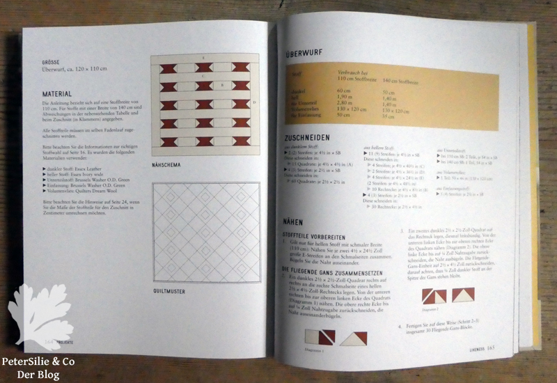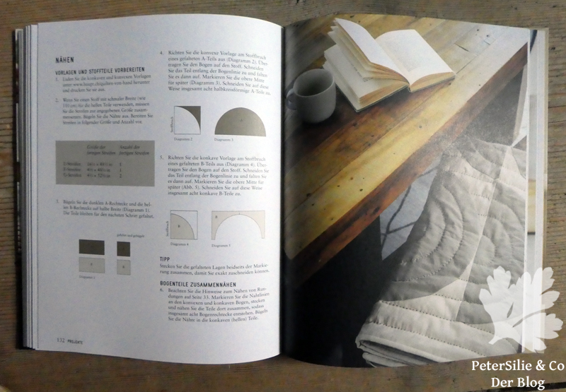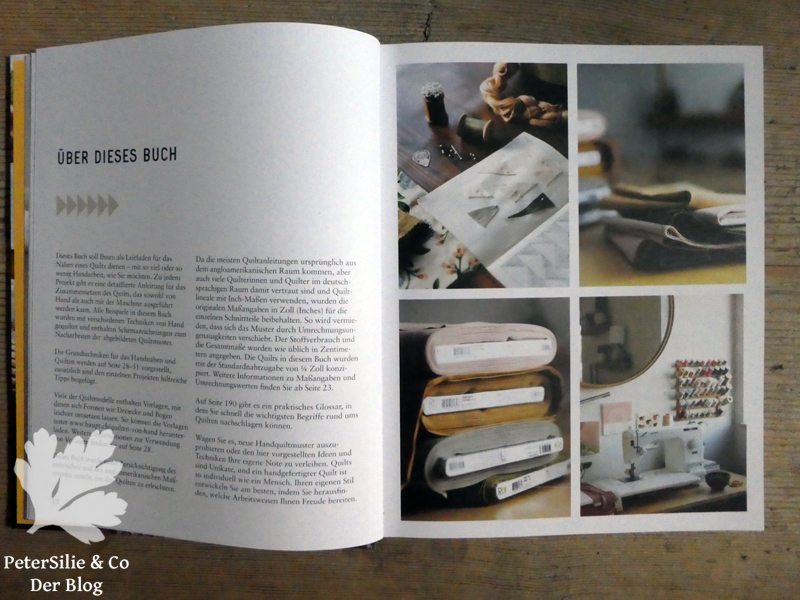 Fazit: Ein sehr schönes stimmiges und trotzdem informatives Buch, schon das Blättern darin wirkt entspannend. Ich bin keine routinierte Patchworkerin und habe noch nie von Hand gequiltet, aber ich nähe sehr gerne mit der Hand. Die Möglichkeiten, die das Handquilten und Patchworken bieten, finde ich fantastisch und verstehe, dass sich jemand ausschließlich damit beschäftigt. Die Quiltarbeit liegt tatsächlich irgendwo an der Schnittstelle zwischen Stickerei und Näherei. Manche Tipps in dem Buch fand ich sehr hilfreich und clever, zum Beispiel den Einsatz der Sicherheitsnadeln.