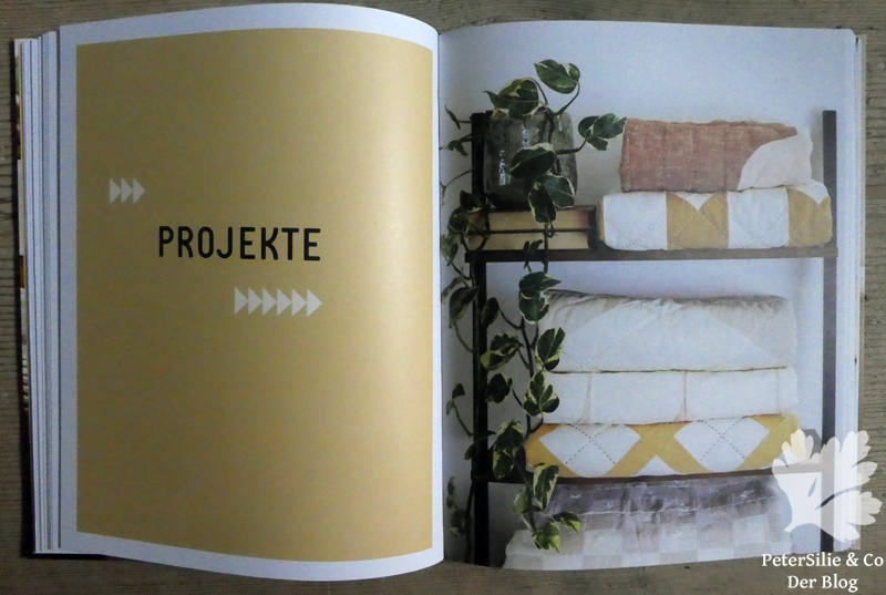 17 Projekte bilden den zweiten Teil des Buches. Die Arbeiten von Riane Elise sind farblich sehr zurückhaltend, wirken dadurch allerdings sehr elegant und zeitgemäß, fast minimalistisch. Man kann sie sich gut in einer modernen Wohnung vorstellen. Es sind keine kleinteiligen Quilts, oft verwendet sie großflächige Formen. Zudem setzt sie nur einfarbige Stoffe ein, bevorzugt in Erdtönen kombiniert mit Weiß und Beige. Die über das Patchwork genähten Quiltmuster sind ebenbürtiges Gestaltungselement. Riane Elise bezeichnet ihre Arbeitsweise als kontrastreiches Handquilten. Das ganze Buch ist illustriert mit sehr schönen stimmigen Fotos von Rebecca Stumpf, schon das Blättern und Lesen darin ist ein Genuss.
