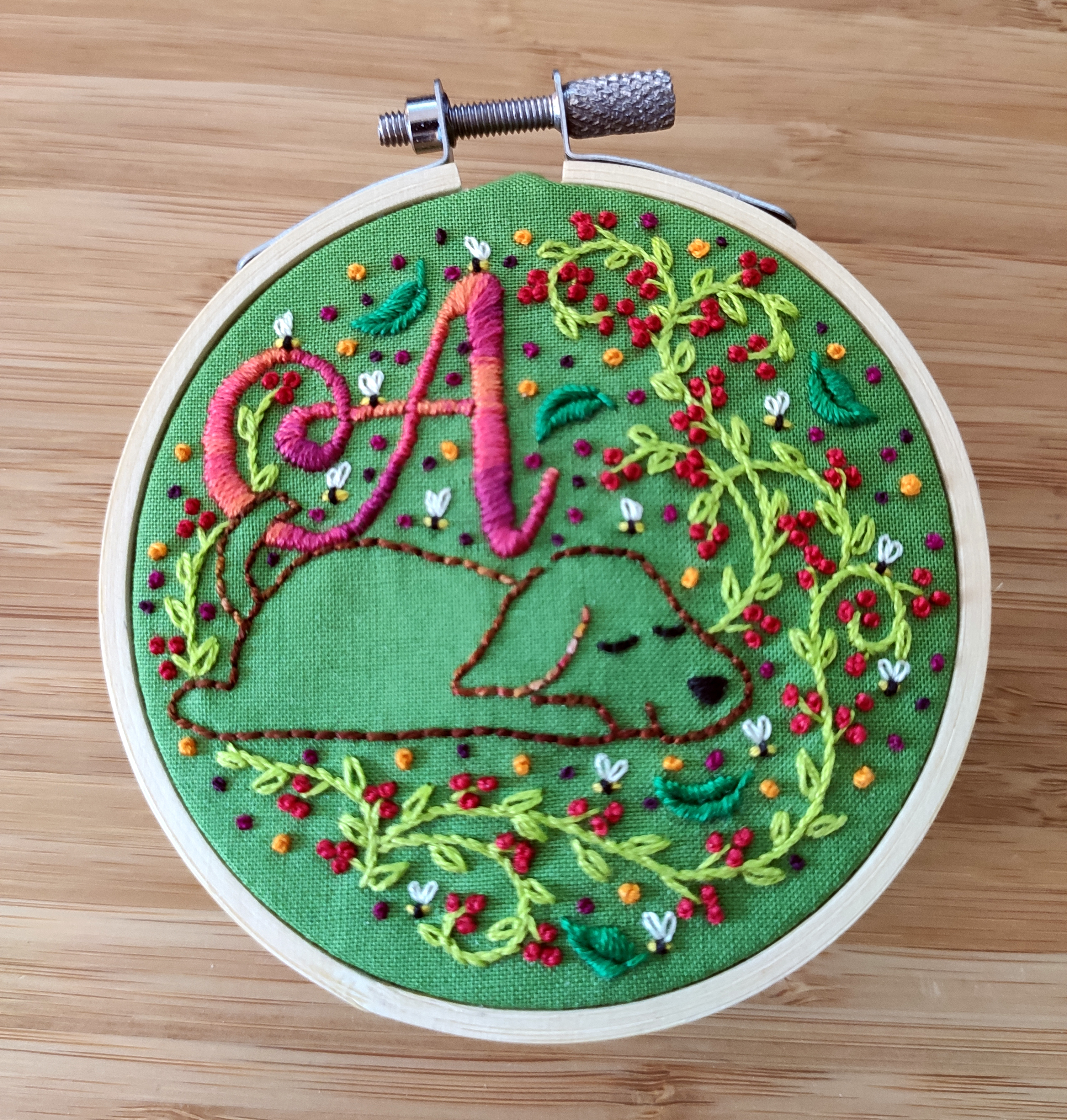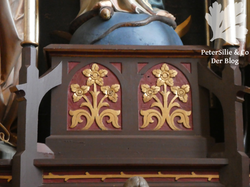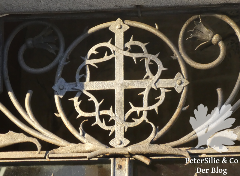 Sabine hat einen natürlich Hang zum Ornament, schon in der Schule entstand aus einer Tierdarstellung ein Ornament. Heute ist das Teil ihres Berufs, sie ist Graveurin und sozusagen professionelle Spezialistin in Sachen Ornament und Schnörkel. Darum beginnen meine kreisförmigen Ornamente mit ihrem gestickten, mit Ornamenten umrahmten, Buchstaben. Das Sonnensymbol gehört neben Blatt und Blütenformen zu den häufigsten und ältesten Ornamenten. Sehr schön fand ich die aus dem Quadrat und/oder Kreis gestalteten Ornamente auf den Seitenaltären unserer Kirche und dem von Anna bemalten Deckel einer Spanschachtel. Auf der Suche nach Ornamenten war die Schmiedeeisenarbeit mit der Dornenkrone, die das Kreuz umschlingt, eine besondere Entdeckung.