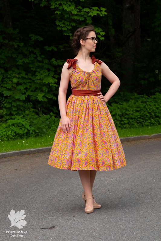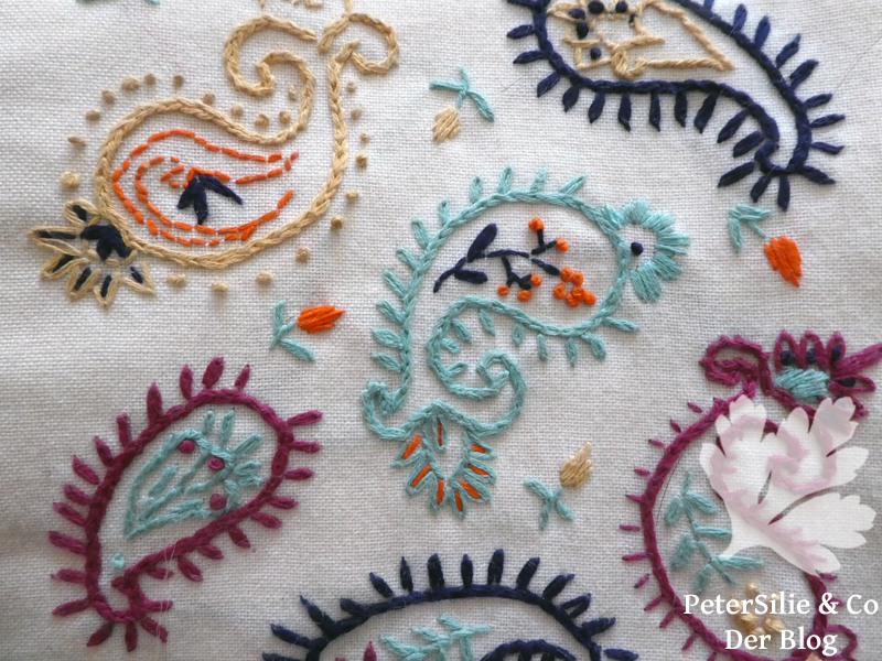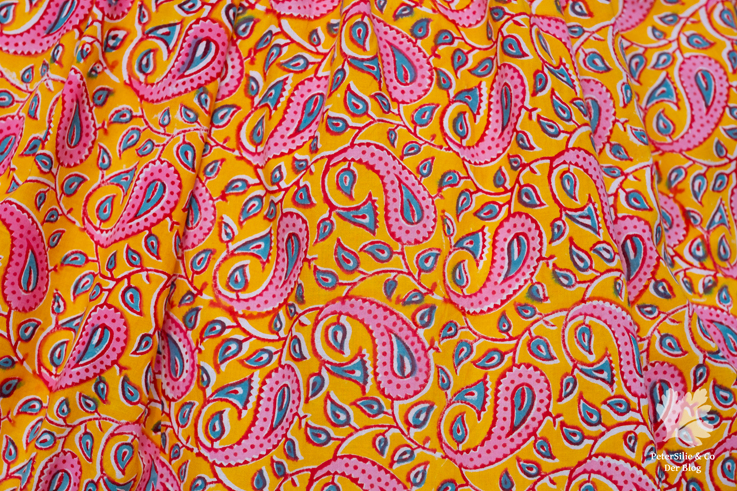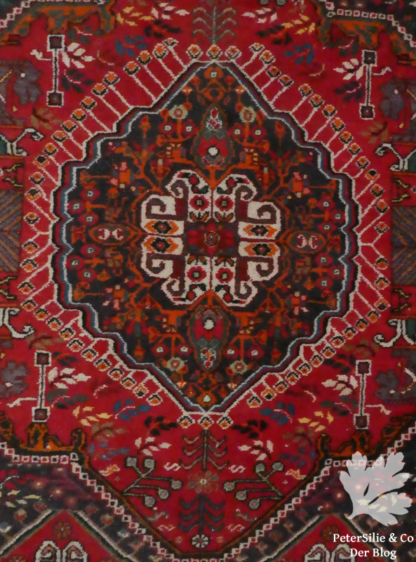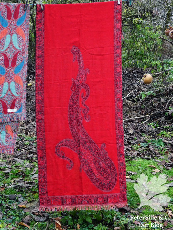 Ein anderes sehr bekanntes Ornament ist das Boteh oder Paisley genannte Motiv. Es findet sich auf sehr vielen Textilien wieder, hier auf den beiden Schals, der blaugelben Krawatte, der Stickerei, der Borte und dem hübschen Stoff von Sabines Kleid. Boteh kommt aus dem persischen und bedeutet „blühender Baum“. Das Ornament stellt den keimenden Samen des Dattelbaums dar, ein Fruchtbarkeitssymbol. Auf dem roten Schal ist das Motiv als großes Einzelornament zu sehen. Auf dem zweiten Schal ist mit Drehen und Spiegeln ein prachtvolles Musterornament entstanden. Auf der Krawatte ist das Paisley zwischen anderen Ornamenten versteckt. Während auf dem hübschen, gelben Stoff von Sabines Kleid die rosafarbenen Paisleys deutlich sichtbar bleiben und mit den sie verbindenden Ranken den Stoff „überwuchern“.