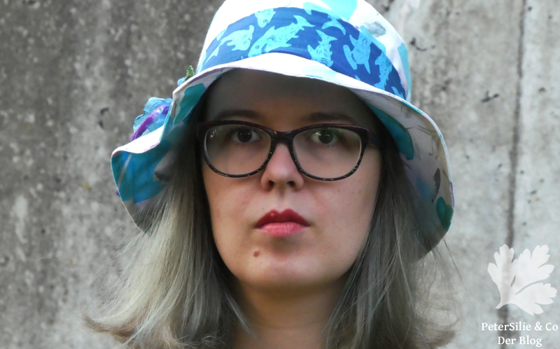 Das dritte Modell, das ich heute zeigen möchte, sieht mehr nach Sommer und Ferien aus. Den Stoff fand ich eigentlich sehr, nun, also sagen wir so: Er erinnerte mich extrem an altmodische Nachthemden oder Bettwäsche. Die Neugierde siegte und der Hut gefällt mir sehr gut. Das Band ist ein Stück Jersey mit Haien drauf, einer meiner Lieblingsstoffe. Die Blumen hatten wir Petersilien vor langer Zeit gemeinsam gemacht. Dieser Hut ist etwas weicher- Sabine stört die Welle in der Krempe, aber ich finde sie ok.