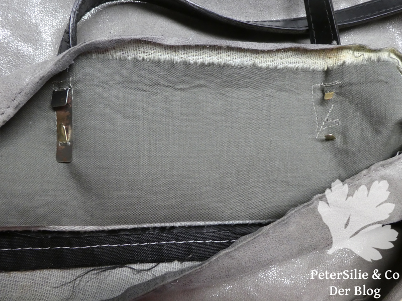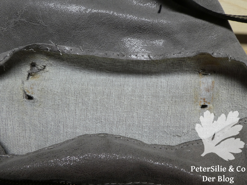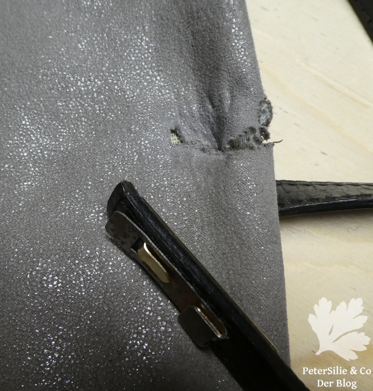 Wenn ich mir im regionalen Buchhandel neue Bücher abhole, werde ich meist gefragt: „Um was geht es denn diesmal?“ So kamen wir ins Gespräch über das Stopfen und zu meinem Angebot ob es nicht vielleicht etwas zum Herrichten gäbe. Bei meinem nächsten Besuch fragte die Buchhändlerin vorsichtig: „Du ich hätte da tatsächlich etwas…“ So erfuhr ich die Geschichte von der Lieblingstasche, bei der ein Griff abgerissen ist: zuviel eingepackt, wer kennt dass nicht…Ich bin keine versierte Taschennäherin und habe die Tasche erst einmal hin und hergedreht und untersucht. Eine der Halterungen war völlig ausgerissen, die anderen drei eingerissen. Irgendwie und zu irgendeinem bestimmten Zeitpunkt im Arbeitsprozess wurden die Griffe befestigt und genauso konnte man sie reparieren.