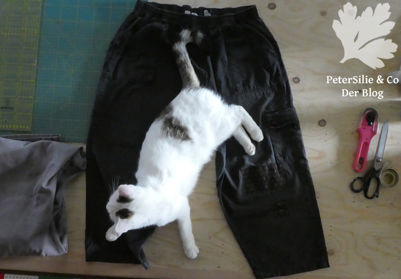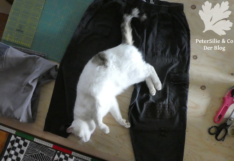 Daraus wurde nichts. Mein Garn (Knopflochgarn) war viel zu dick, die Stiche wirkten bestenfalls unbeholfen und ich habe der Hose damit eher geschadet als genützt. Außerdem gab es sehr viele dünne Stellen an schwierigen Stellen. Da die Besitzerin gerade ihren 80.Geburtstag feierte habe ich letztlich zurückhaltendere Stoffe gewählt: Einen Rest eines japanischen Double Face (hier vernäht) und ein Streublümchenmuster aus Baumwolle Beige auf Schwarz, ein Dirndlstoff. Die Flicken sind mit beidseitig klebender Vlieseline aufgebügelt und mit der Maschine mit dem Zickzack-Stich festgesteppt. Unsere Katzendame Frida hat sich bei den Fotos jedenfalls auf Friedas Hose sehr gut gefühlt…