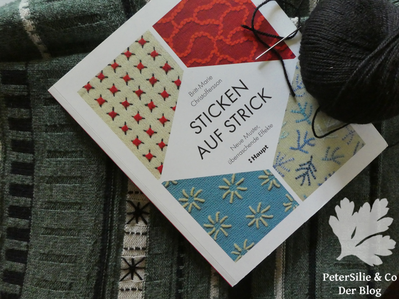 Da die weißen Streifen vorne schon deutliche unentfernbare Russflecken (oder ähnliches) aufwiesen, habe ich die letzten Tage mit schwarzer Wolle darüber gestickt. Inspiriert wurde ich dazu von dem Buch Sticken auf Strick von Britt-Marie Christoffersson erschienen im Haupt Verlag.