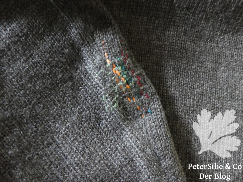 Super warm, aber nicht sehr strapazfähig…Der Pullover hat schon vor längerer Zeit Armflicken erhalten. Die Löcher sind neu und ich wollte mich endlich am Visible Mending- also dem bewusst sichtbaren Stopfen versuchen. Ich habe mir das größere Loch zuerst vorgenommen. Das war vielleicht ein Fehler. Bei dem kleineren hatte ich den Dreh schon heraus…
