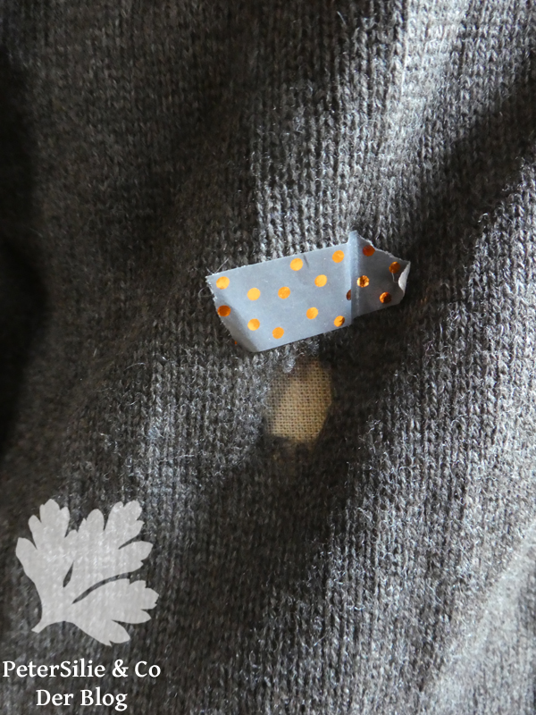 Bei dieser Jacke wollte ich irgendetwas Dekoratives versuchen. Grundsätzlich ist es ja so, dass man, wenn man mit dem Reparieren beginnt, seinen Patienten erst einmal wirklich gründlich untersuchen sollte, bei Sonnenschein, starkem Licht und am besten auch noch im Gegenlicht. Es zeigen sich dann meist viel mehr Löcher und Löchlein, als man vermutet. Diesen Cardigan habe ich Oma gewissermaßen direkt ausgezogen, daher hatte er erst einmal eine Wäsche nötig. Dann entfernte ich die Fussel und das Pilling. Danach nahm ich ihn genau in Augenschein. Es gab sehr viele Löcher und undefinierbare kleine Flecken (Am Bild markiert mit Washitape).