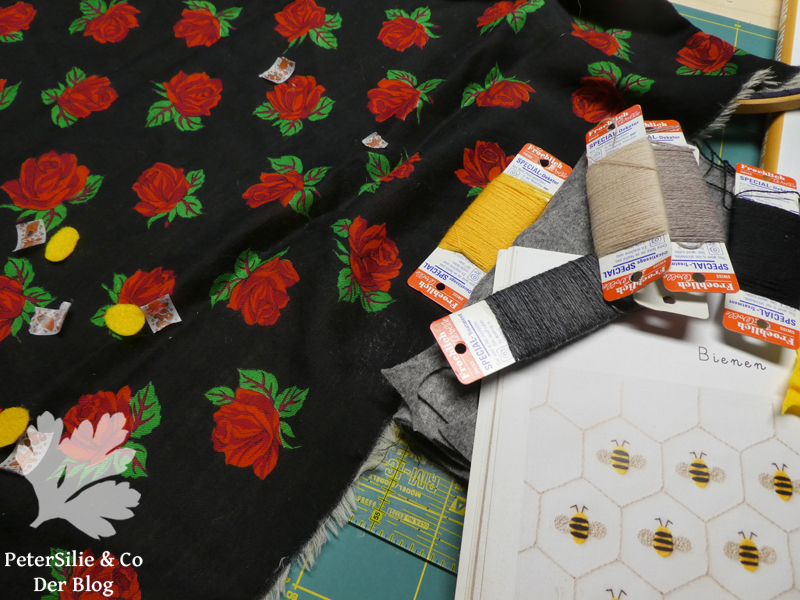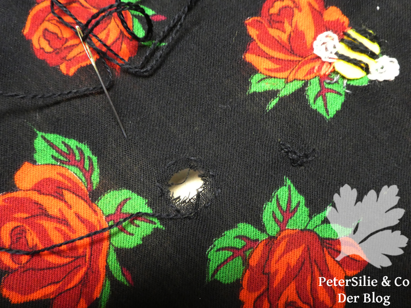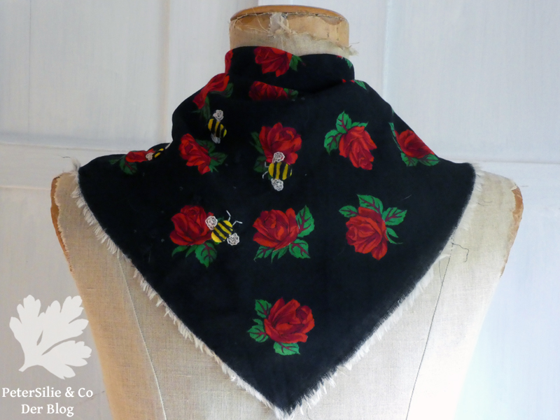 Dieses Wolltuch im richtig kitschigen Rosenprint habe ich letztes Jahr am Flohmarkt erstanden. Ich wusste, dass es Löcher hat- bloß nicht, dass es so viele waren- aber ich wollte es unbedingt. Bei einem Tuch ist es vielleicht nicht immer ganz leicht die beste Möglichkeit der Reparatur zu finden, da man häufig beide Seiten sieht und die gestopfte Stelle nicht zu steif werden darf. Erst dachte ich an eine Applikation mit schwarzer Spitze. Dann habe ich es schlichtweg in einem Stickkorb vergessen. Jetzt habe ich es beim Aufräumen wieder entdeckt und mich sehr spontan für eine witzige Lösung entschieden. Gestickte Bienen sollten die Blüten umsurren. Das Motiv stammt aus dem Buch Einfach Sticken mit Applikationen hier bereits vorgestellt und schon oft zur Hand genommen. Die Bienen habe ich aus gelbem Bastelfilz ausgeschnitten und mit Wollgarn festgestickt, genauso die Flügel (im Kettstich) und die Fühler. Einige kleinere Löcher habe ich mit schwarzer Wolle im Spannstich überstickt. Ein paar aufgeklebte Glitzersteine lenken von den nicht sehr gleichmäßigen Stopfstellen ab- für mich sind es Tautropfen…Da man ein Tuch üblicherweise eher selten und dann mit der Hand wäscht, hoffe ich, dass meine Stickerei durchhält…
