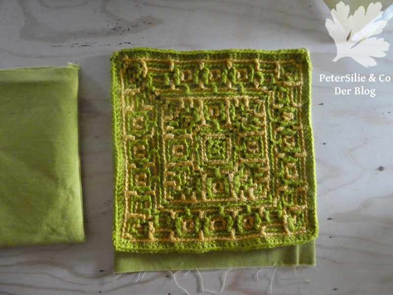 Sabine brachte auch die Restwolle mit, um eventuell damit eine Rückseite zu häkeln. Was mir vorschwebte war aber mehr eine Taschenklappe aus dem Häkelmotiv im Kontrast zur glatten Fläche des Stoffs. Der Haken am Ganzen: Diese Farben liegen so gar nicht auf meiner Linie, dadurch besitze ich fast nichts Passendes an Material. Fast nichts, denn im Hinterkopf hatte ich schon diesen grünen Stoff, aber würde er reichen? Es dürfte nicht überraschen, dass der Stoff ein Rest ist von Sabines Rock.