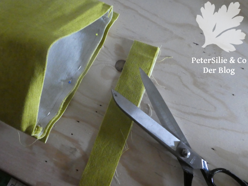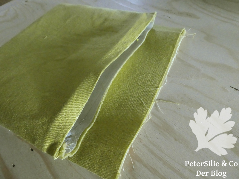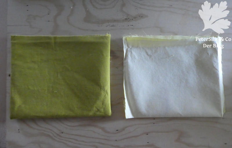 Das Futter würde Gelb werden. Ich habe mich für eine sehr einfache Tasche ohne Boden entschieden. Sowohl die Futter- als auch die Außenstoffe der Tasche sind verstärkt. Das gibt Festigkeit und es ist nicht nötig mit ganz steifem Verstärkungsmaterial zu arbeiten. Außerdem kann man auf der Vliesseite prima vorzeichnen. Bei der Klappe ist nur ein Stoff verstärkt.