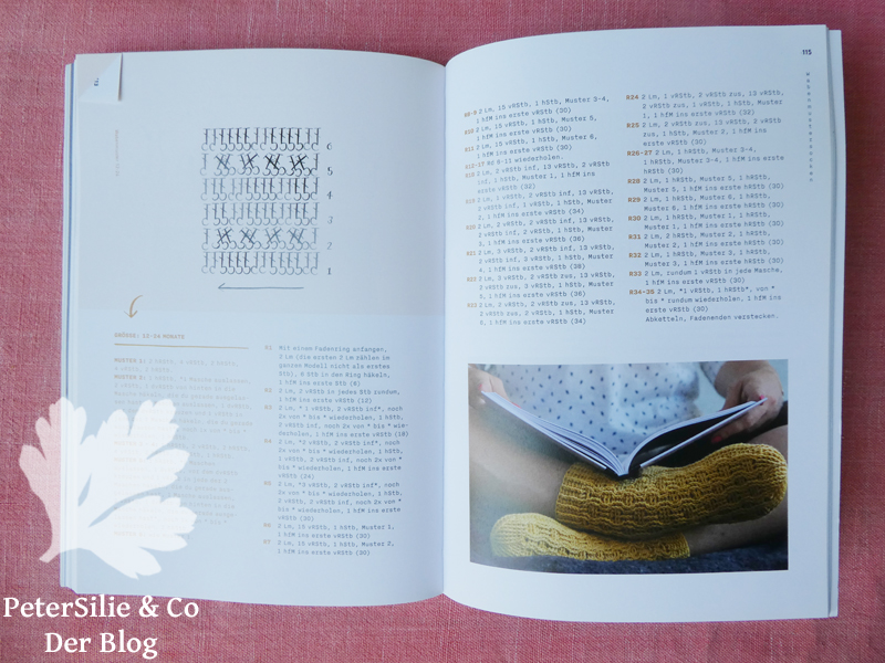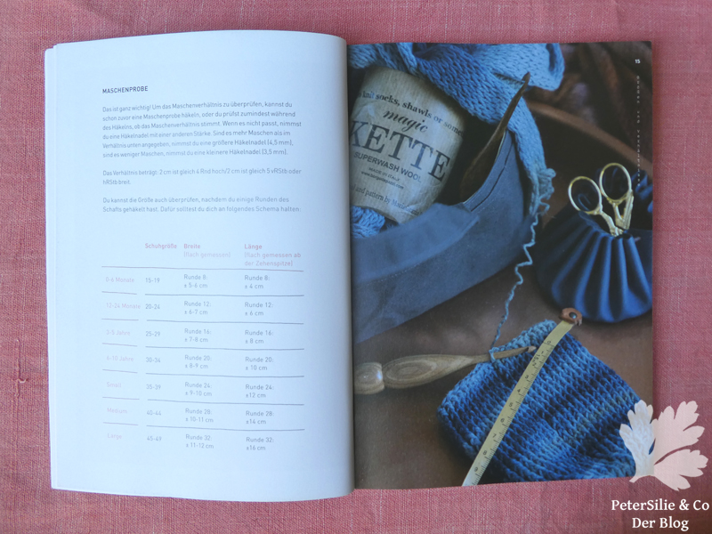 Was ich in dem Buch solala finde, ist die Angabe des Materialbedarfs. Es wird nur in Standard Sockenwolle Knäuel der Bedarf angegeben. Tatsache ist für ein paar Socken in kleinster Grösse braucht es keine 210 Meter. Und ich denke, gerade wenn man Reste zuhaus hat, ist es doch nett zu wissen, geht sich da noch ein Paar Babysocken aus oder nicht?